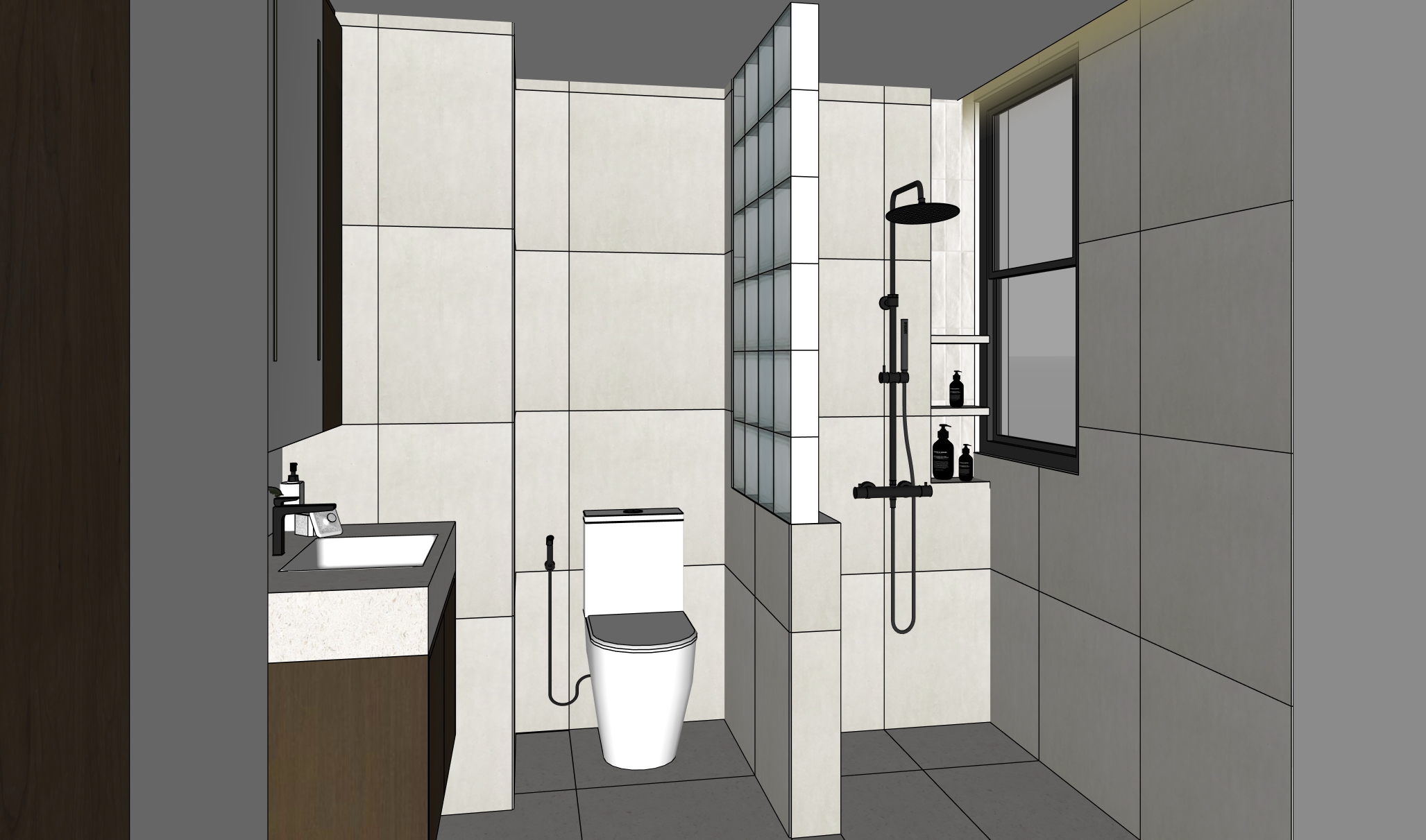 colours and texture to remain acuurate as per picture floor in light beige terrazzo like stone tile wall tiles in light beige glass block to have white paint coat at the side