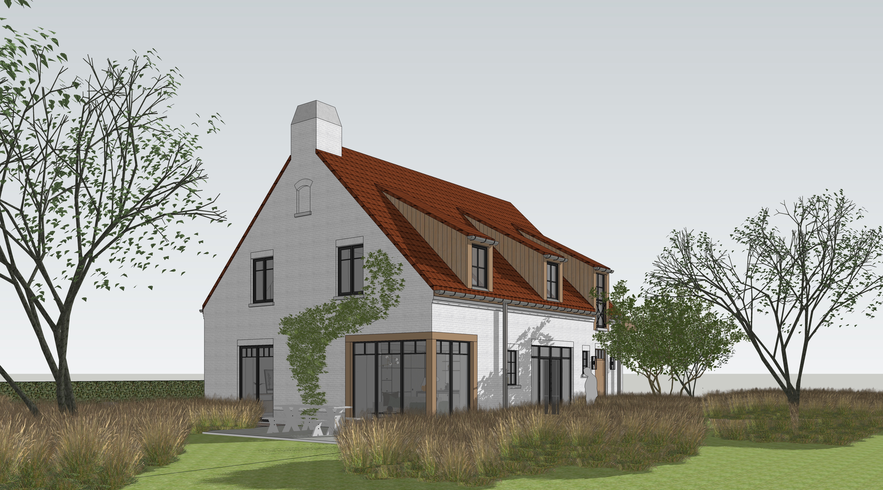 shot like real estate photography 35mm lens natural light photography realistic camera exposure red brick stone fa ade with wood carpentry around windows and grey blue stone at the bottom