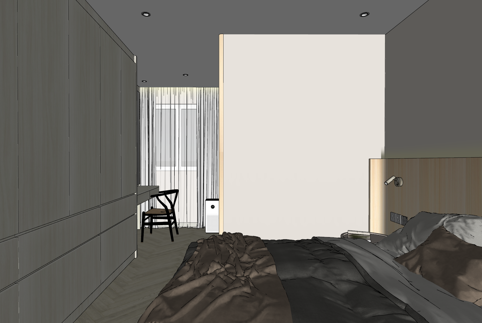 wardrobe is in light birch wood finish bedframe headboard is using japanese hinoki cypress wood in vertical woodgrains the ceiling comes with recessed downlights and make the overall vibes brighter
