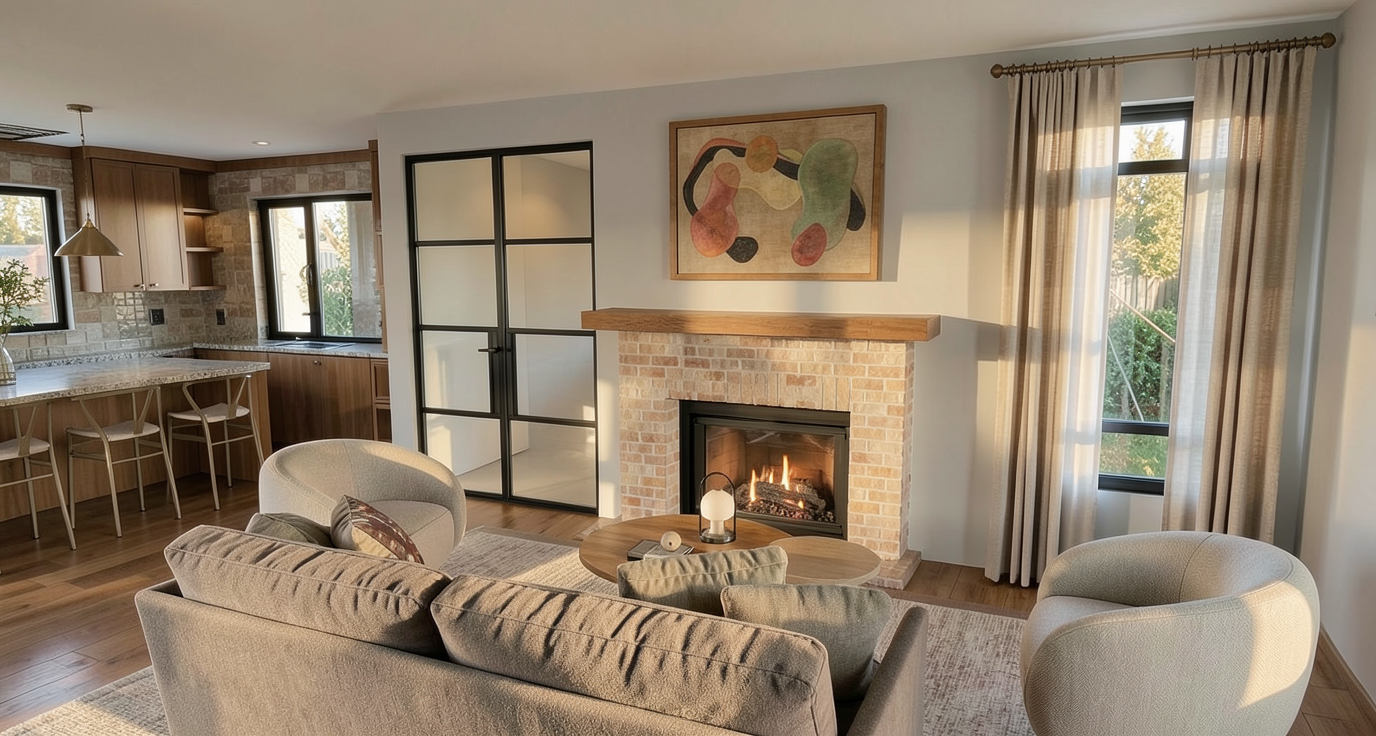 create a photorealistic rendering of the attached sketchup image maintain geometry proportions and locations of materials the context is a narrow urban infill lot with a two strip driveway down the right side similar sized houses are located on the adjacent lots to the left and right time of this rendering should be late afternoon golden hour