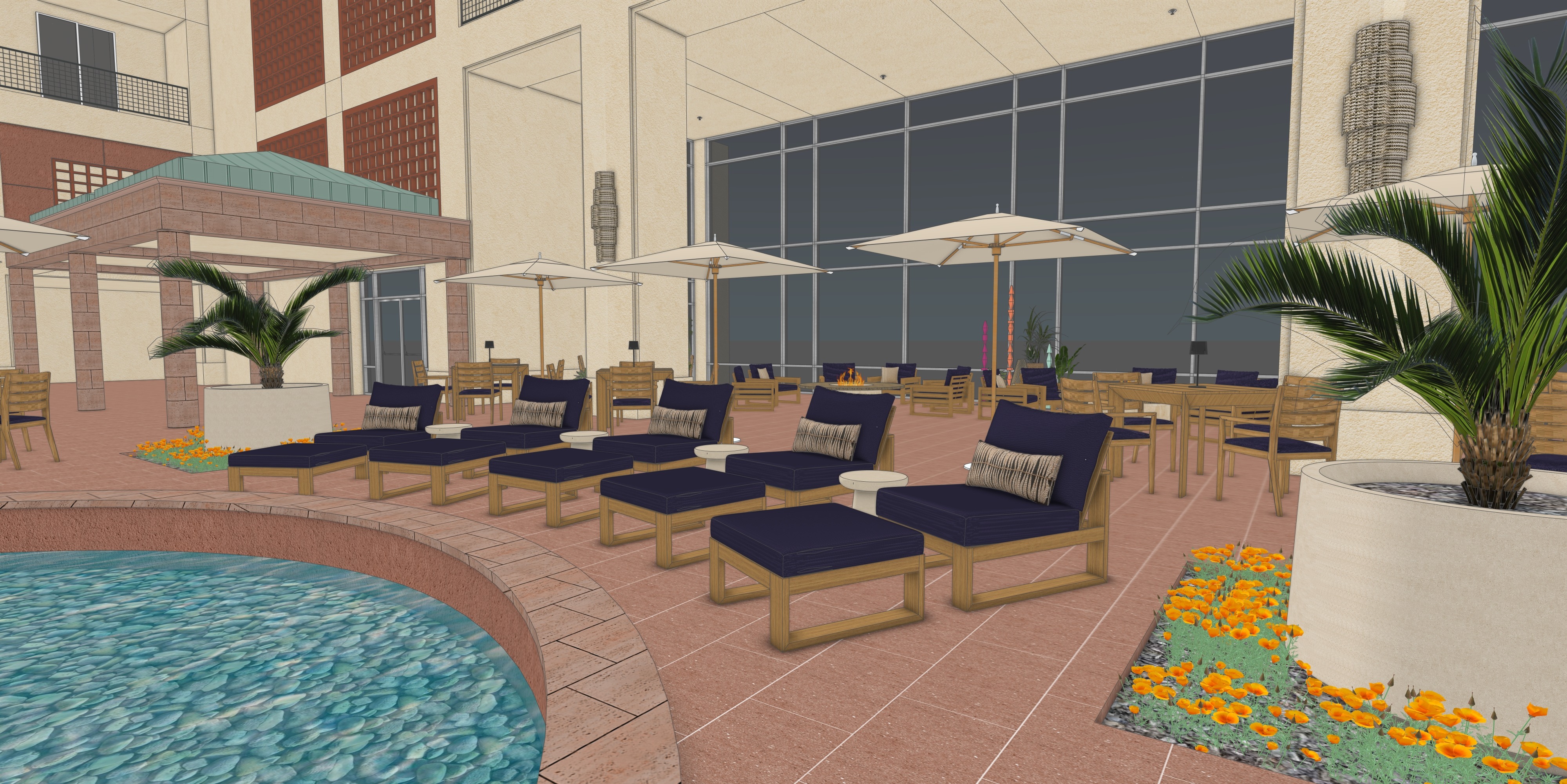 dusk view wicker lights at column emit a soft glow windows on ground floor emit soft glow but reflect foreground in a blurry manner upper windows emit a soft warm light pool has contiuous lightstrip along upper edge