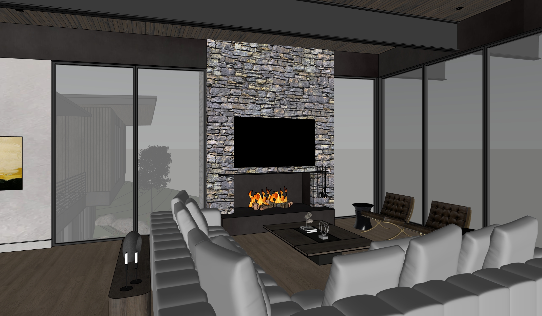 do not remove or change any geometry in image rough hewn tennessee fieldstone dark metal window frames cold rolled steel beams cold rolled steel above windows smooth finished interior stucco wall add light to can lights home located in north carolina hardwood forest with dense trees below home late afternoon light with light clouds and light shafts view of blue ridge mountains in distance room is 20 above the ground so no plants or hardscape directly outside of windows