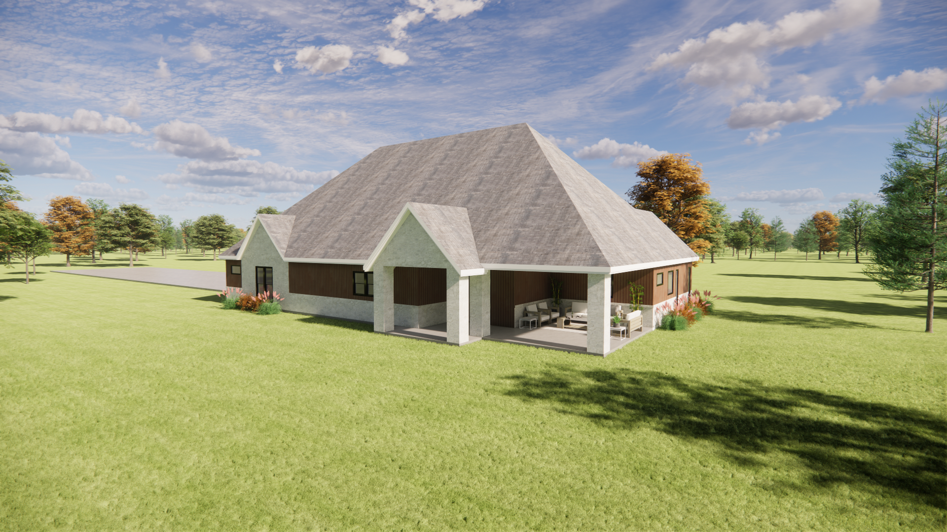 you are a professional image renderer you create the highest grade renderings around and specialize in architectural renderings this is the rear elevation of a house create a high resolution photorealistic image of this structure keep the windows as they are where they are keep the doors as they are where they are keep the main structure as it is where it is feel free to change the perspective keep the roofline as it is where is it do not add anything to the structure that i have not asked for the roof is composition shingles architectural style the background will be a pastoral background similar to rural east central texas it should be early afternoon with a bright sunny day clear skies the landscaping should be late summer with plenty of color and should be that of a luxury estate