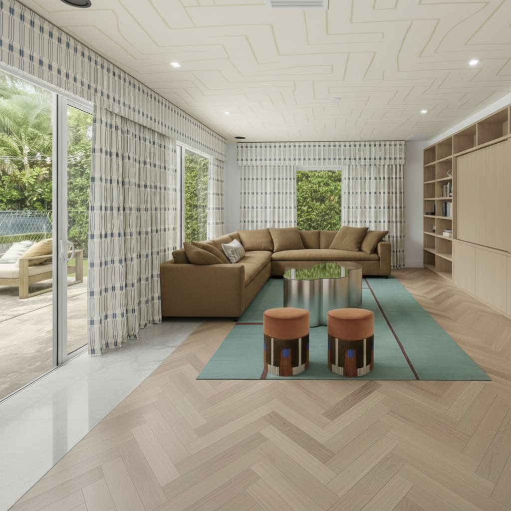 evening lighting in the space add lighting inside the glass cabinets with the wine glasses add lighting on the marble countertop add a wine and cheese platter on the marble countertop add wine bottles inside the two wine refrigerators make the view to the outside through the french doors dark with some lights on from a condo building next door add a man a playing a game of with a woman next to him waiting to take a shot with balls randomly arranged on the table add two modern pendants lights over the pool table make the lighting inside the cabinets the same for all of them keep the cabinets white like the source image add more light on the table the walls are painted white add light coming from the recessed fixture in the upper left corner of the view