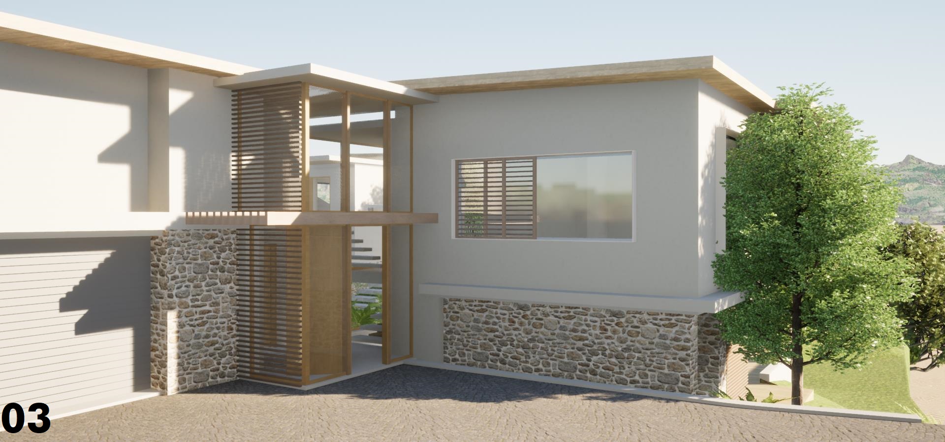 contemporary natural materials walls smooth grey plaster lush gardens paving with grass tinted glass off shutter concrete edges
