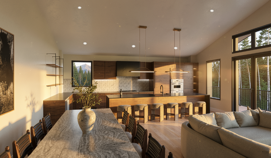 transform this interior rendering into a highly photorealistic image while preserving the exact architecture layout and all furnishings as shown do not alter or redesign any furniture materials or placements maintain the original design intent precisely enhance all surfaces with realistic materials natural imperfections and accurate textures wood grain stone variation fabric weave improve depth reflections and shadow realism set the lighting to golden hour with warm low angle sunlight entering through the windows create soft elongated shadows subtle highlights and a natural glow that enhances the warmth of the space add slight lens effects such as gentle light bloom or minimal sun flare for realism but keep it refined and not overly stylized update the exterior view through the windows to a natural landscape of dense pine and aspen trees with a layered forest feel and soft mountain light ensure the outdoor lighting matches golden hour conditions and integrates naturally with the interior lighting include a deck visible through the windows with a clean modern black railing that complements a mountain modern aesthetic add a neutral textured throw blanket draped naturally over the sofa to enhance warmth and styling keeping it subtle and cohesive with the existing palette ensure realistic exposure balanced contrast and true to life color grading the final result should feel like a professionally photographed luxury interior not a rendering output should resemble high end architectural photography shot on a full frame camera with natural lighting crisp focus and soft depth of field