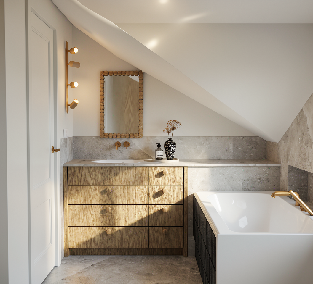 use exactly the same geometry layout and camera angle from the reference image do not alter add or invent any element do not move resize or reinterpret any cabinet shelf drawer or structural element only apply material changes all built in cabinets doors drawers and shelves in oxford white satin finish flooring in white oak texture porcelain tile geometry is locked flat panels for all drawers no shaker style white warm light on the chandelier