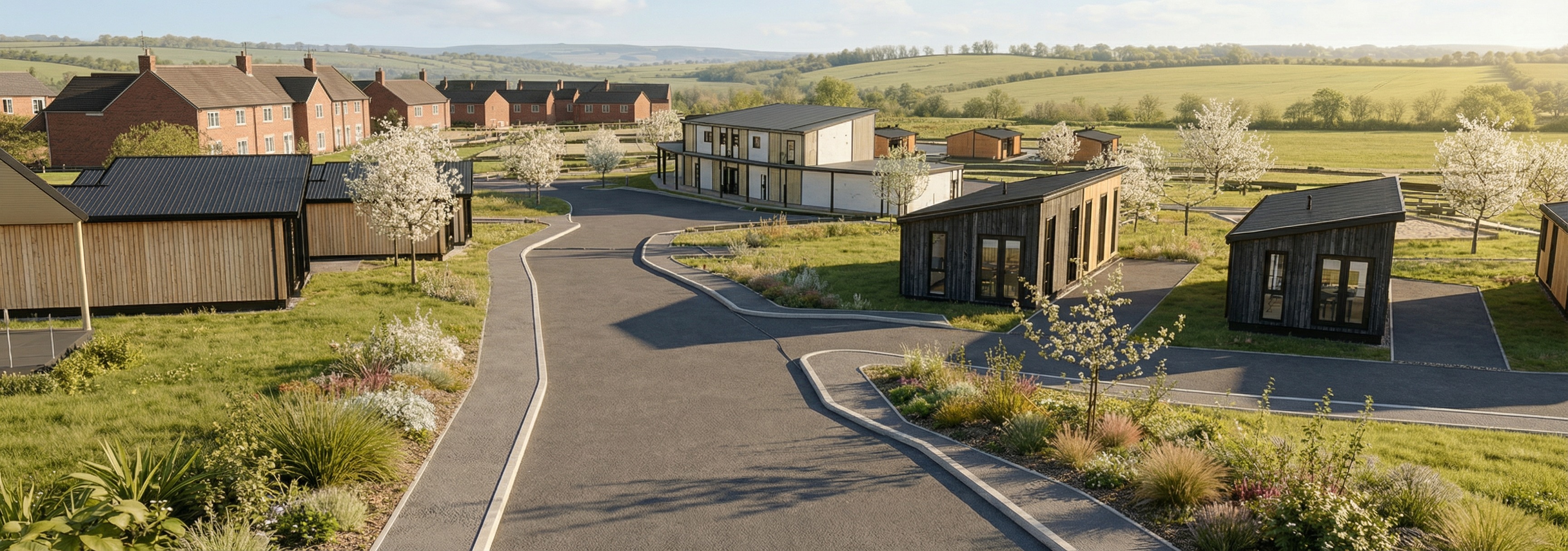 render a modern holiday park with black and timber clad lodges should be set in spring in the british countryside with native planting and light foliage there should be a red brick housing estate in the background and a red brick care home