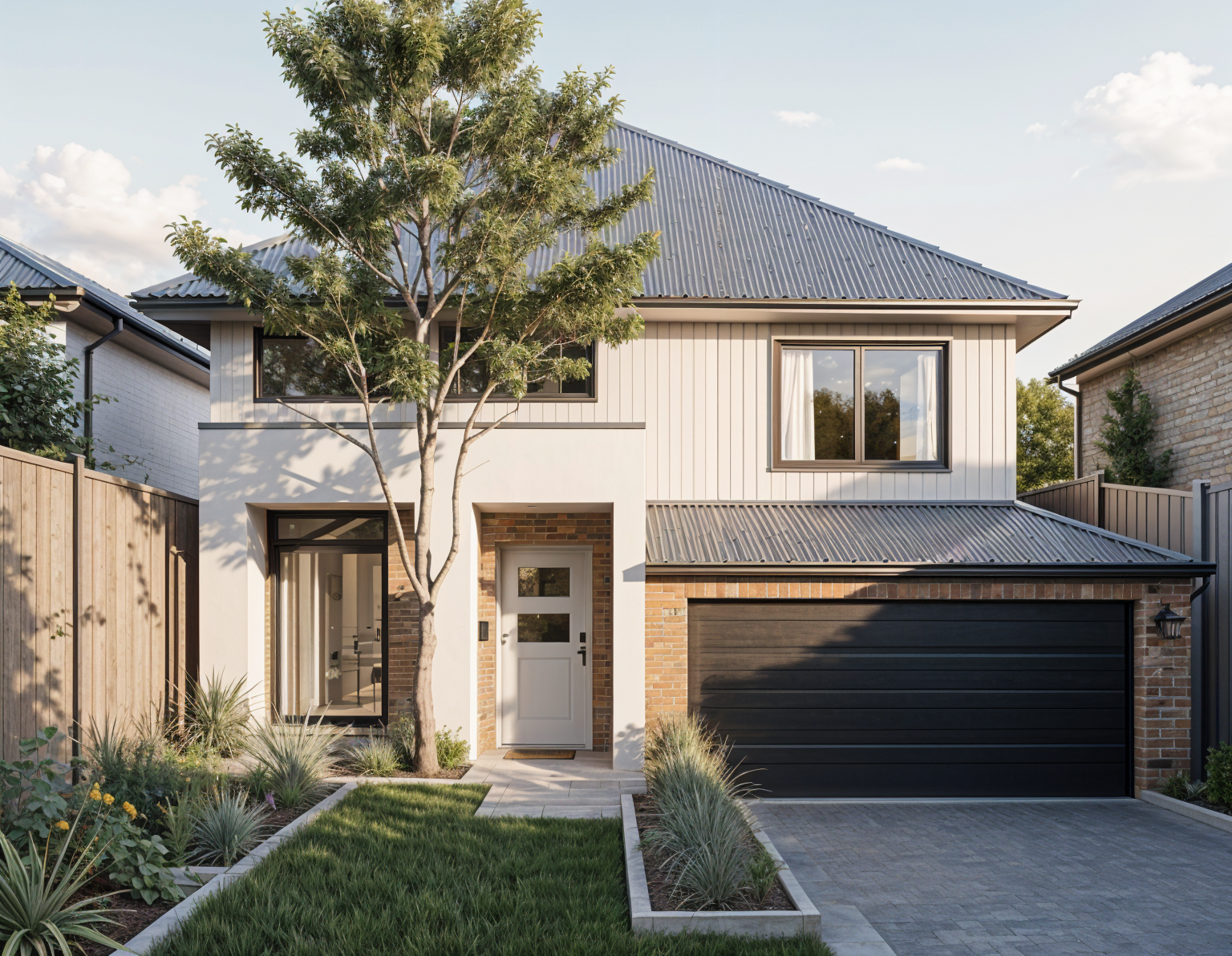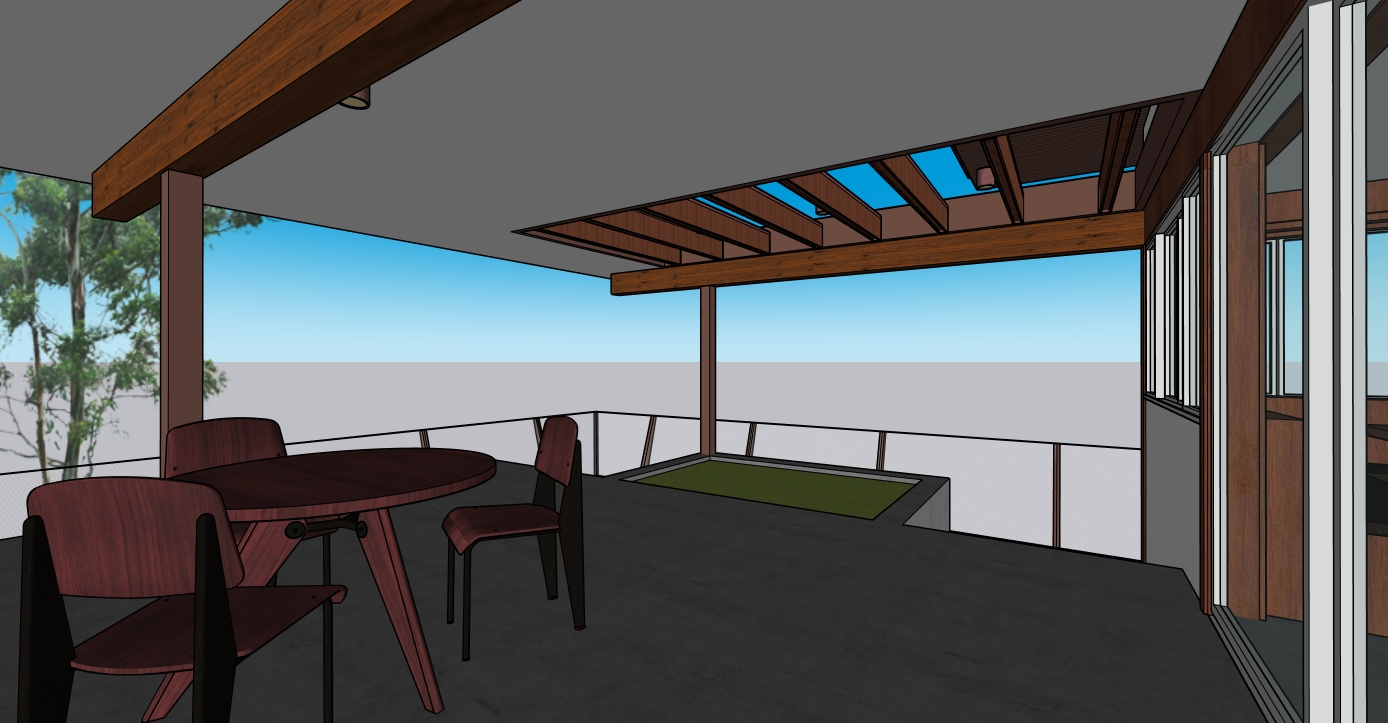 generate a photo realistic rendering grey cement micro topping floors warm white plaster ceiling exposed wood beams wire cable mesh guardrail that is not highly visible beyond set in a lush southern california hillside landscape at golden hour