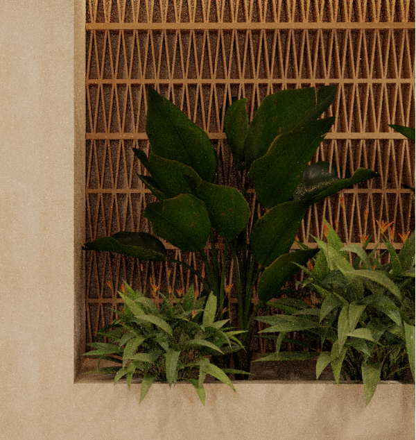 ultra realistic close up architectural detail strict control keep the exact framing composition and scale do not reinterpret the scene do not transform it into a garden scope limitation very important do not add new plants do not increase plant density do not change composition of vegetation do not change scale or arrangement only improve realism of existing elements celos a de barro main focus enhance depth and shadow between pieces clearly define joints and modular assembly reinforce thickness of each ceramic piece subtle imperfections small chips tonal variation matte slightly porous clay texture maintain exact design no reinterpretation edges and geometry apply very subtle edge rounding micro bevel eliminate sharp cg edges keep geometry intact wall important material definition interior clay stucco finish arcilla tipo estuco interior smooth but with very fine micro texture uniform and refined not rough not exterior monocapa not worn not eroded matte soft and elegant light absorption very subtle tonal variation only planter same geometry and size same stucco material as wall improve contact shadows and slight edge wear no redesign vegetation controlled keep exact same plants and quantity only improve realism better leaf definition subtle variation in green tones correct light reflection no plastic shine slight translucency do not make it lush wild or garden like lighting warm soft consistent enhance micro shadows and depth no dramatic contrast or spotlight effect surface realism remove noise grain add micro imperfections only where realistic avoid overly clean cg look final look high end architectural detail photography refined calm material focused interior quality no garden feel no exterior roughness no artificial textures is an indoor space not natural light only artificial lights in the picture respect the light composition