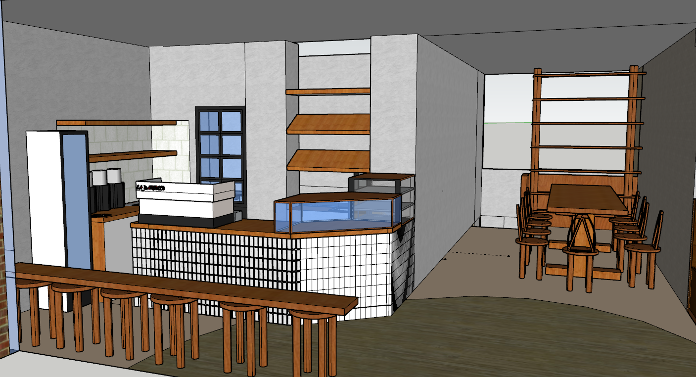 interior shot this is a coffee shop on the left are you see the serving and order bench and on the right side you can see a long table with chairs