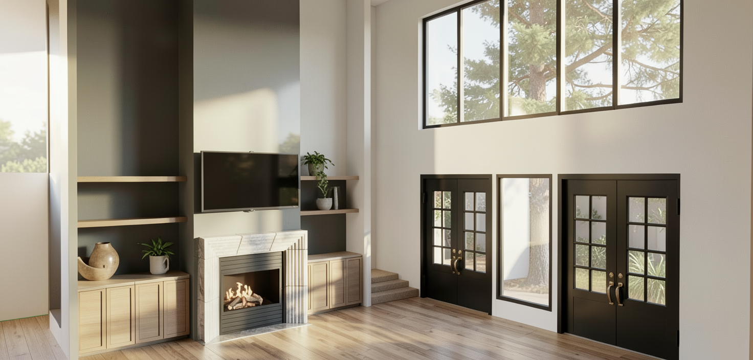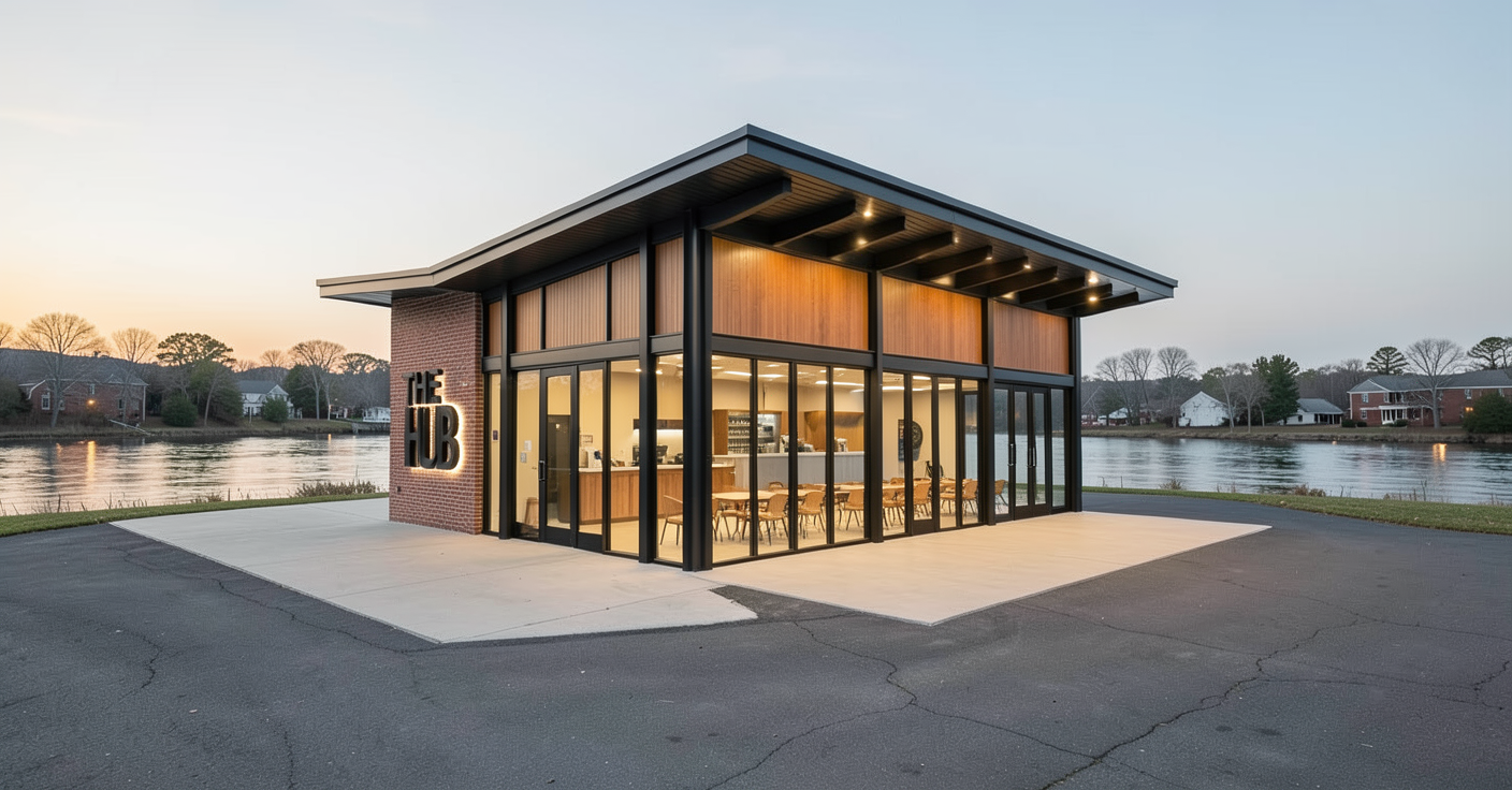 design a 1 200 square foot pavilion located in selma alabama situated near a riverfront setting with a contextual relationship to the historic surroundings the architectural concept should blend vintage historic character with modern industrial design the front fa ade and approximately one third of one side of the building should feature traditional red or warm toned brick expressing a classic historic southern aesthetic this portion includes the main public facing elements aluminum storefront systems with glass entry doors and a concessions service window integrated into the brick fa ade on the brick portion of the side elevation the one third brick side incorporate large vertically scaled black metal lettering spelling the hub with the word the positioned above hub in a stacked arrangement the signage should be backlite and feel bold industrial and integrated into the architecture the remaining two thirds of the building rear and side elevations should transition into a modern industrial expression these elevations should consist primarily of full height glass storefront systems framed in black metal creating transparency and strong indoor outdoor connectivity toward the river incorporate black metal wrapped structural columns along these glazed fa ades to emphasize rhythm and vertical articulation above the glass storefront systems include warm wood paneled transoms to soften the industrial character and introduce natural material contrast the roof is a metal butterfly roof with matching black metal soffits reinforcing the modern industrial aesthetic while maintaining durability interior the space should be minimally furnished with only simple tables and chairs emphasizing openness and simplicity material palette primary brick glass black metal secondary warm natural wood accents burnished cmu interior design intent the pavilion should feel inviting open and civic oriented with a strong visual connection to the riverfront and surrounding landscape lighting soft natural daylight with warm interior glow in early evening renderings warm exterior lighting at the concessions entry doors and roof soffits