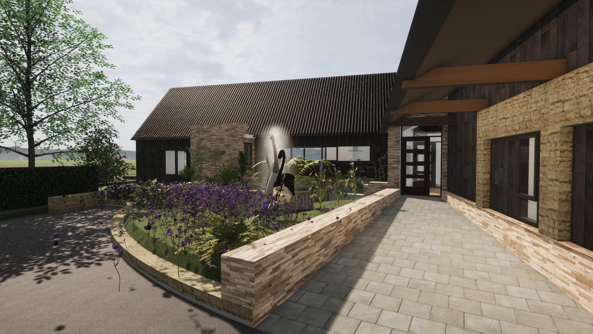 render a serene garden scene with a rustic house featuring a sloped black corrugated roof and stone facade the pathway is paved with light gray stones bordered by low stone walls a vibrant garden filled with lush greenery and purple flowers surrounds a black swan fountain creating an elegant focal point soft sunlight filters through the green leaves of a large tree casting gentle shadows the atmosphere is peaceful and inviting with a clear blue sky overhead