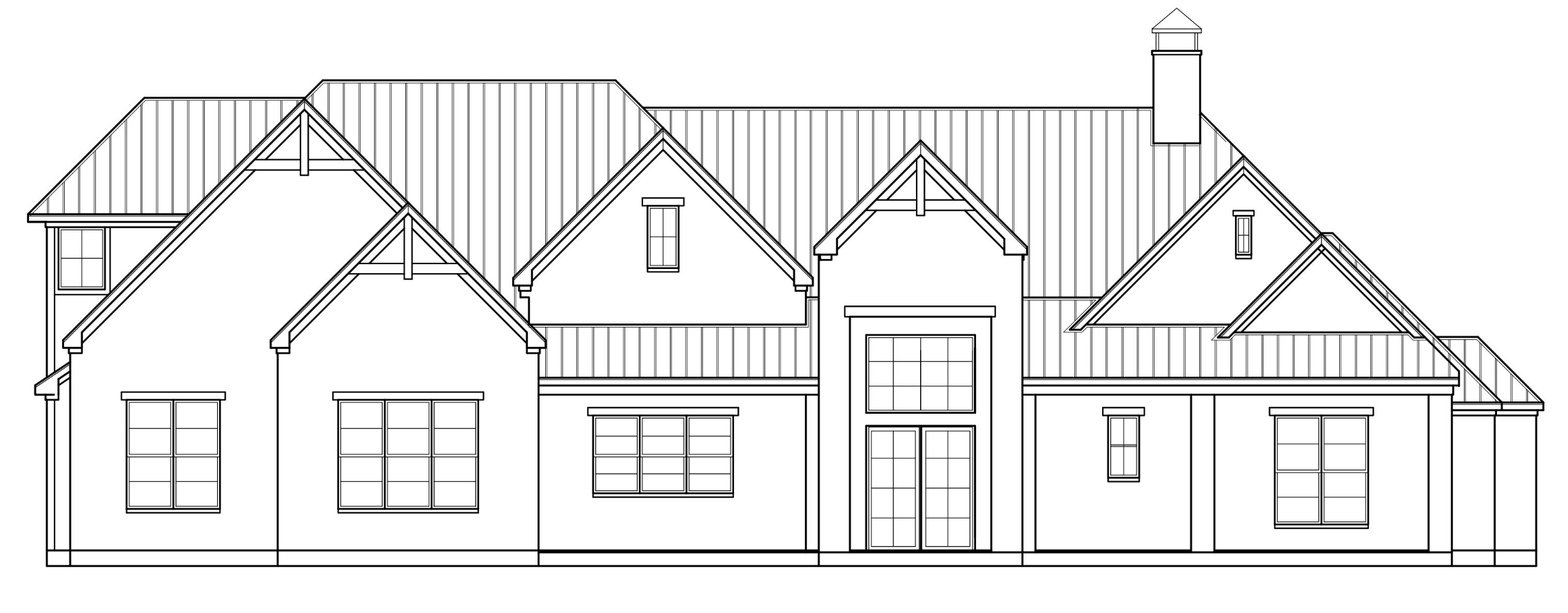 black metal roof white limestone exterior set the house in a wooded enviornment at sunset