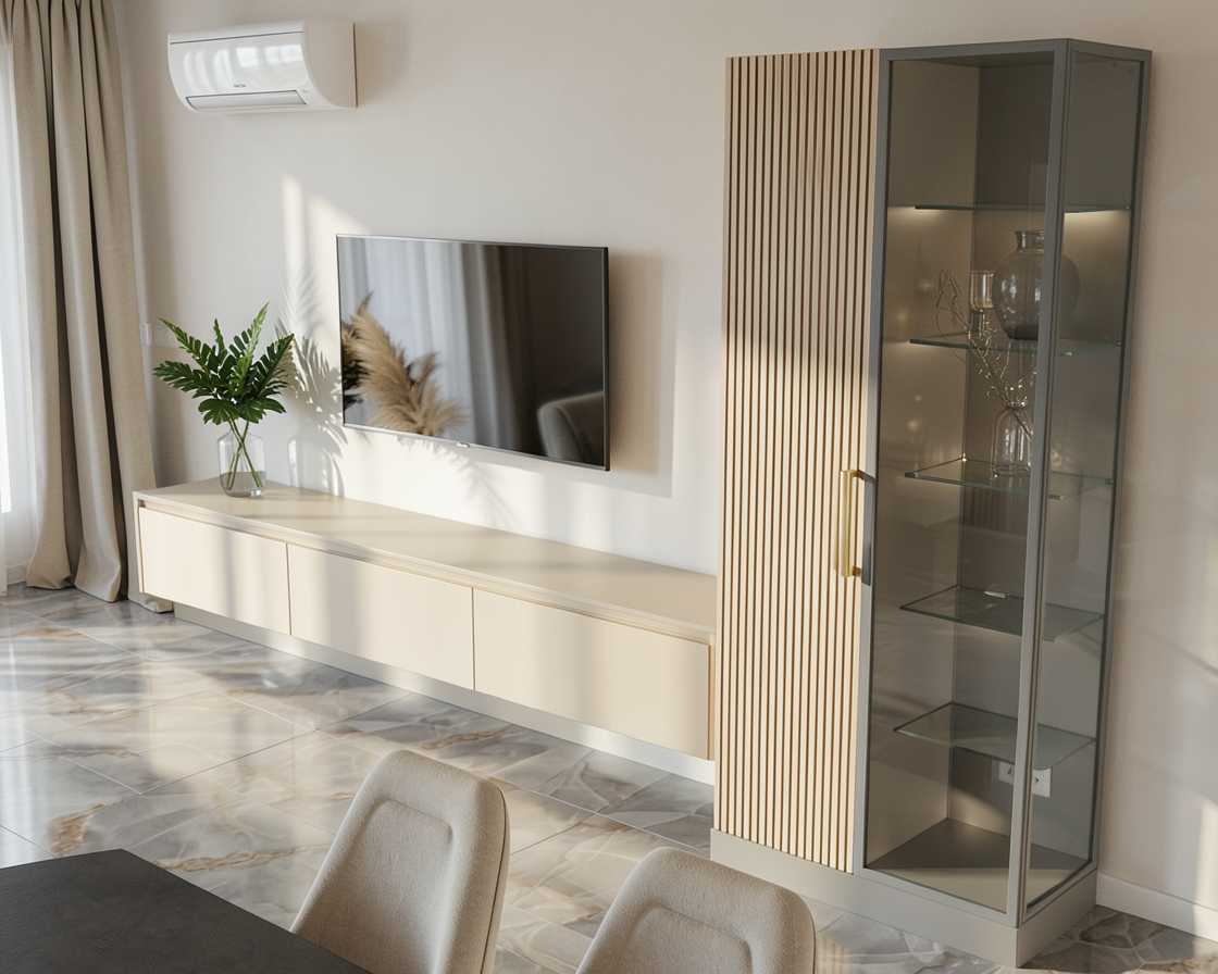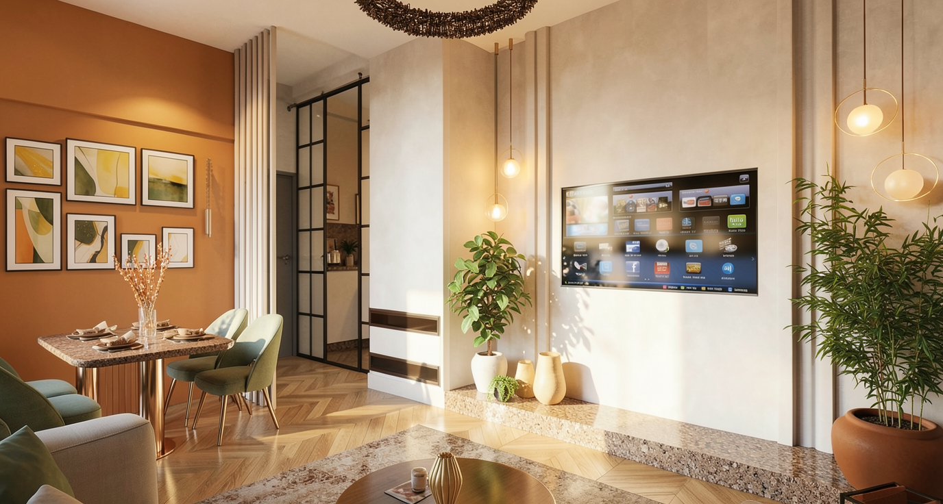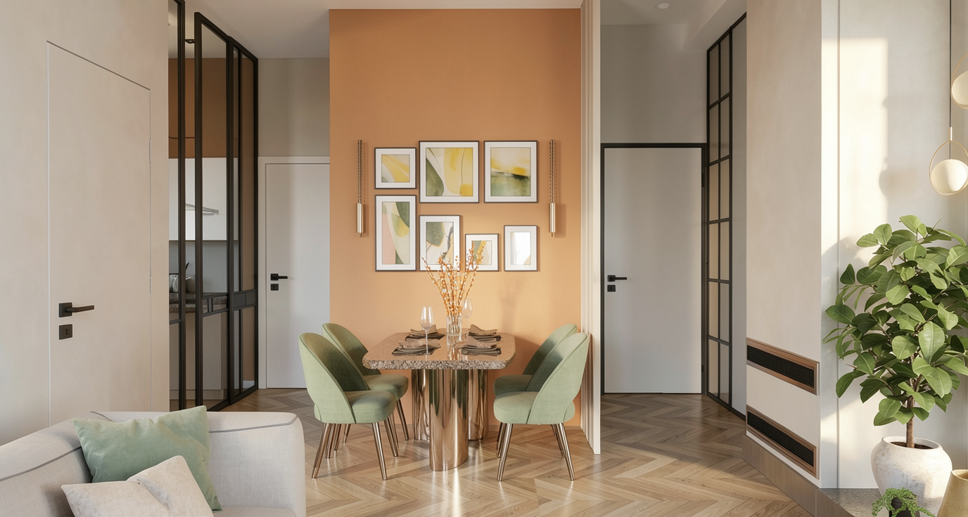 do not change any objects remove the beam on the orange colored wall next to the door there is a wardrobe with a sliding mirror mechanism the parquet flooring should be slightly cooler in tone but still with a natural wood nuance use natural lighting as well as the ceiling lights only the dining table has shiny metallic bronze legs and the countertop is made of quartz in a brown color