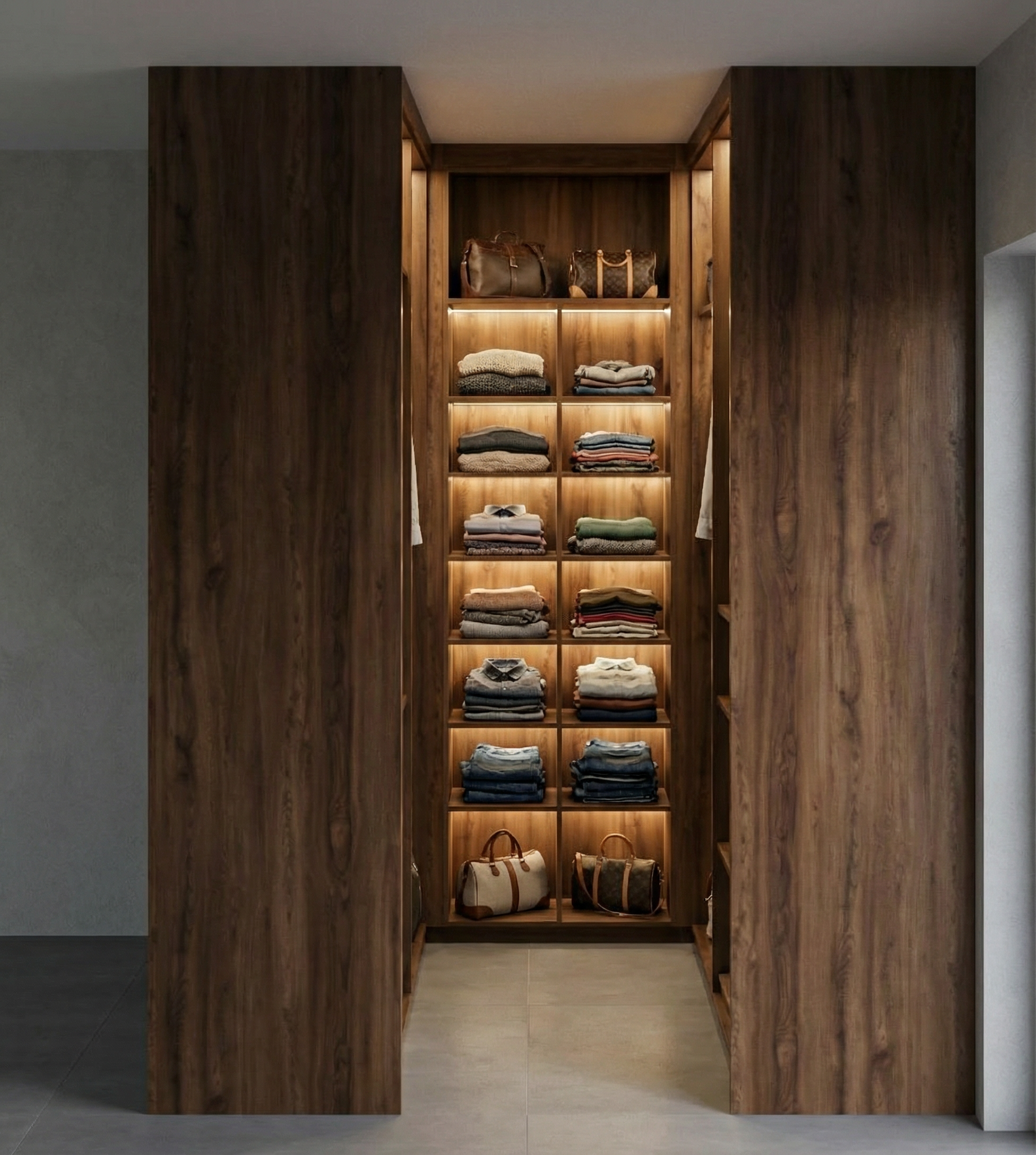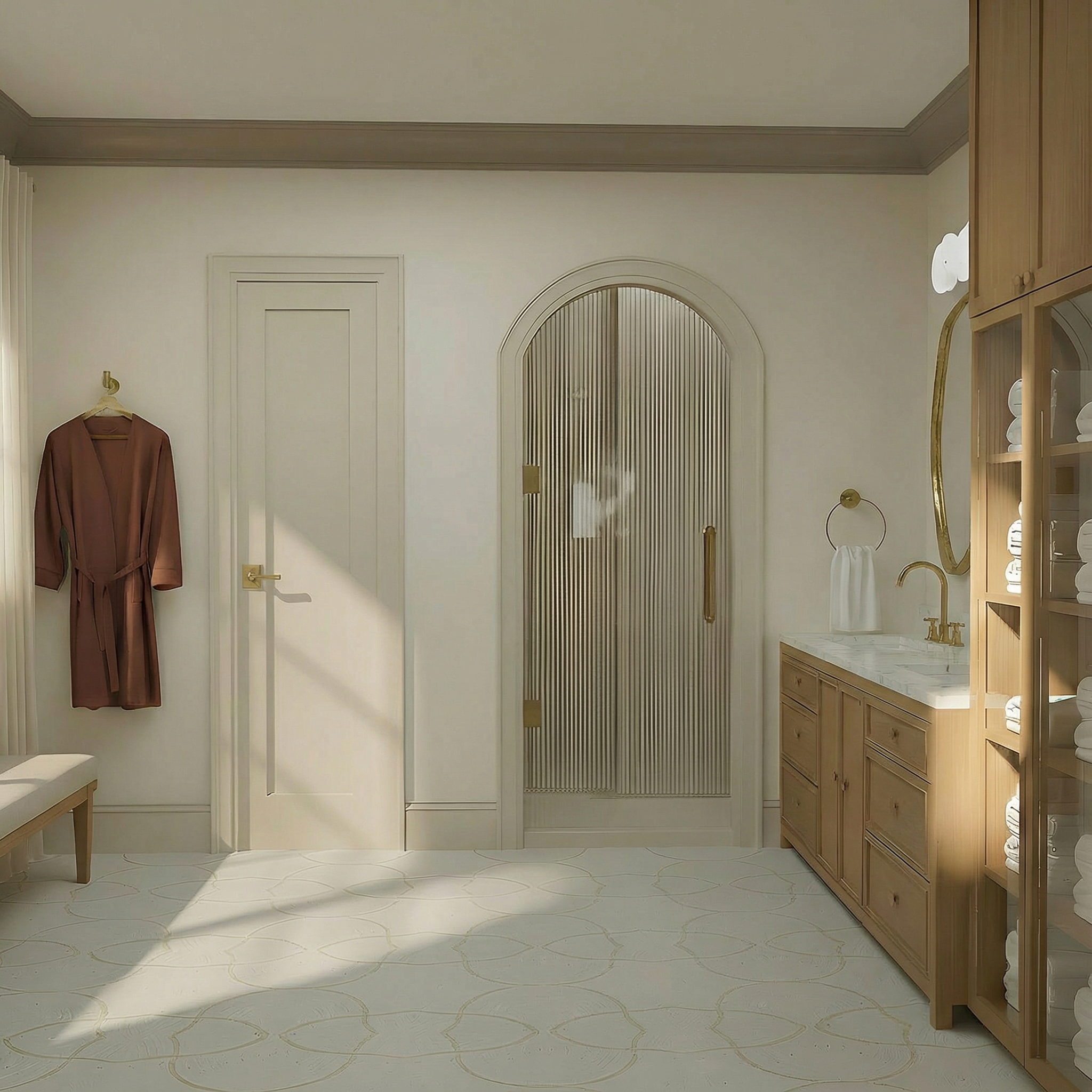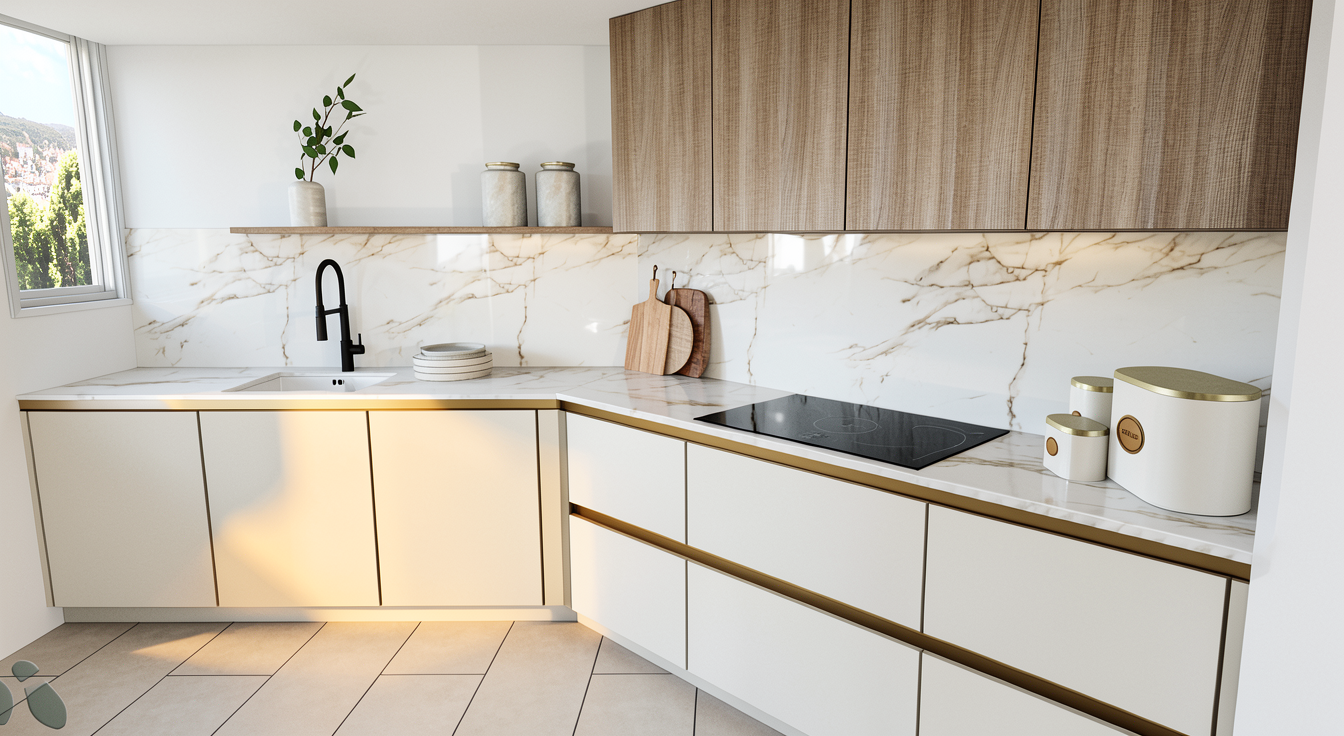 do not change any objects remove the beam on the orange colored wall next to the door there is a wardrobe with a sliding mirror mechanism the parquet flooring should be slightly cooler in tone but still with a natural wood nuance use natural lighting as well as the ceiling lights only the dining table has shiny metallic bronze legs and the countertop is made of quartz in a brown color