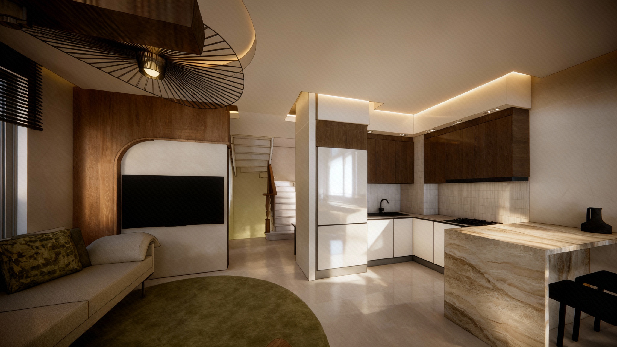 modernist exterior shot a modern architectural rendering of a 3 story duplex with dark brownoil based paint og lng down siding glass balustrade the setting is in a suburban environment with a clear sky blue background and soft natural daylight illuminating the structure lush green landscaping frames the perimeter adding a touch of nature to the scene architecture