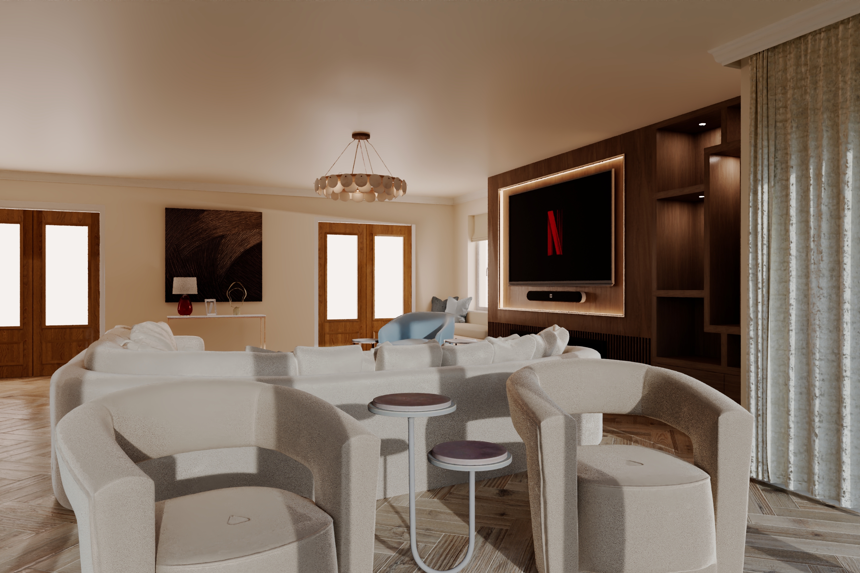 improve the lighting the armchairs at the front are light beige velvet the sofa is slightly darker beige velvet the double doors have internal frosted glass add neutral decor onto wooden shelves