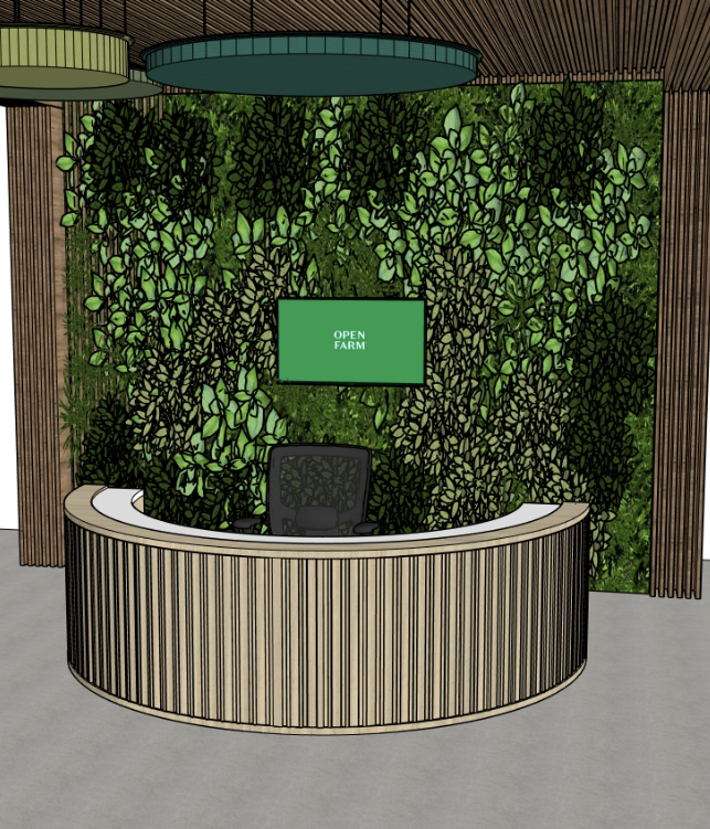 living wall along the back can you add pot lights in the ceiling around the acoustic panels suspended from ceiling add open farm merch or minimalist office items on desk add silhouettes interacting in space