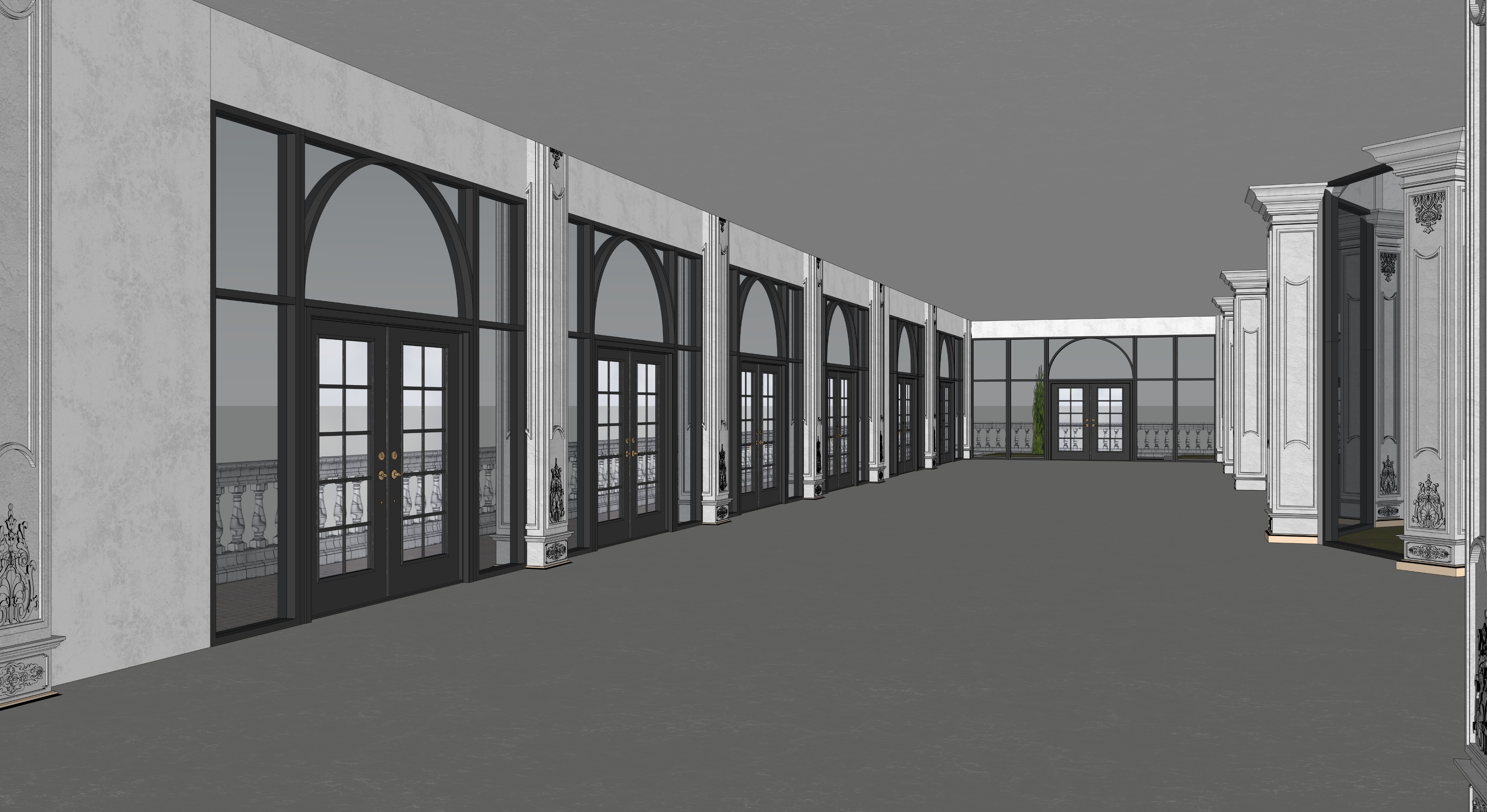 do not add put anything that is not in the prompt maintain the geometries maintain all the materials this is an interior french style architecture function hall building maintain the view camera position composition make this hyperrealistic add banquet tables with people populate the scene as if there is a wedding function decorate the interiors using french style architecture design the ceiling with french style architecture ceiling and lights add sea background lower the horizon line make it cinematic make it wedding vibes make it a clear weather make it super clear clean 8k quality
