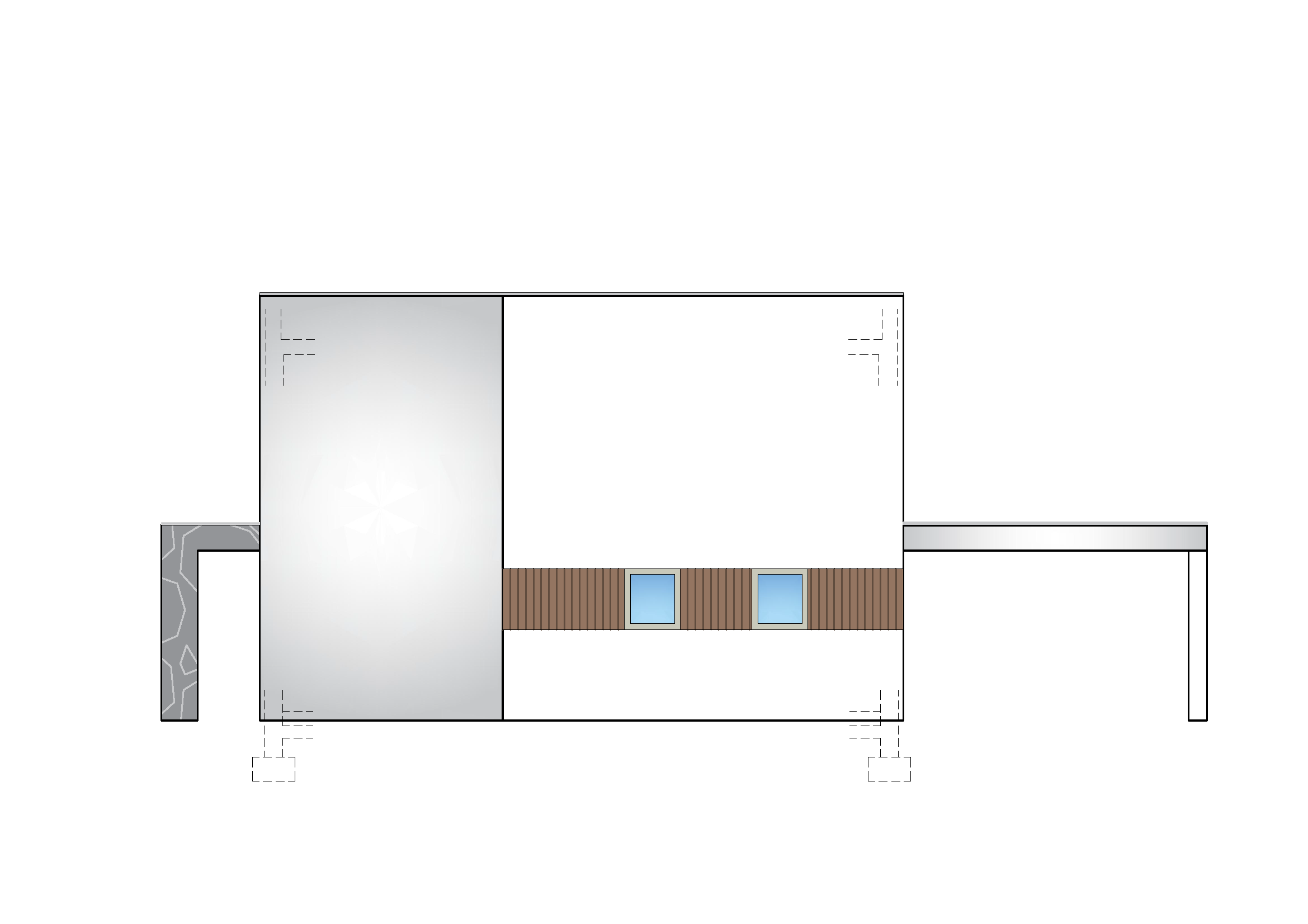 modernist exterior shot the colour of the wall is white and light brown and there are two small windows on the left the wall is out of stone architecture