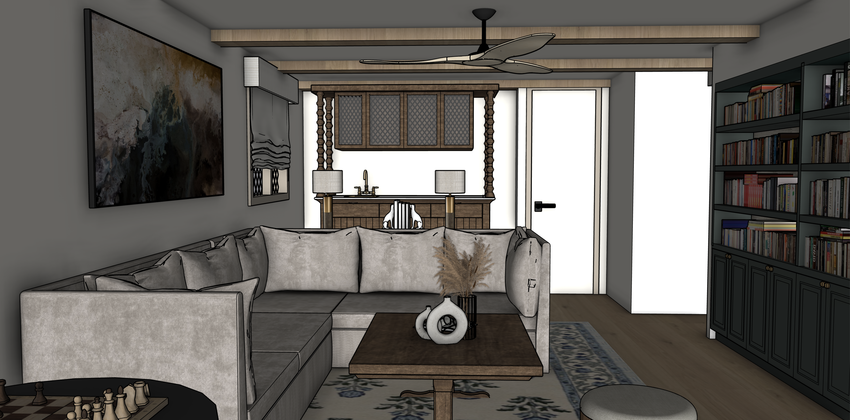 keep colors exactly the same floor is white oak bookcase is blue green with a gray undertone walls are white sofa is taupe color velvet