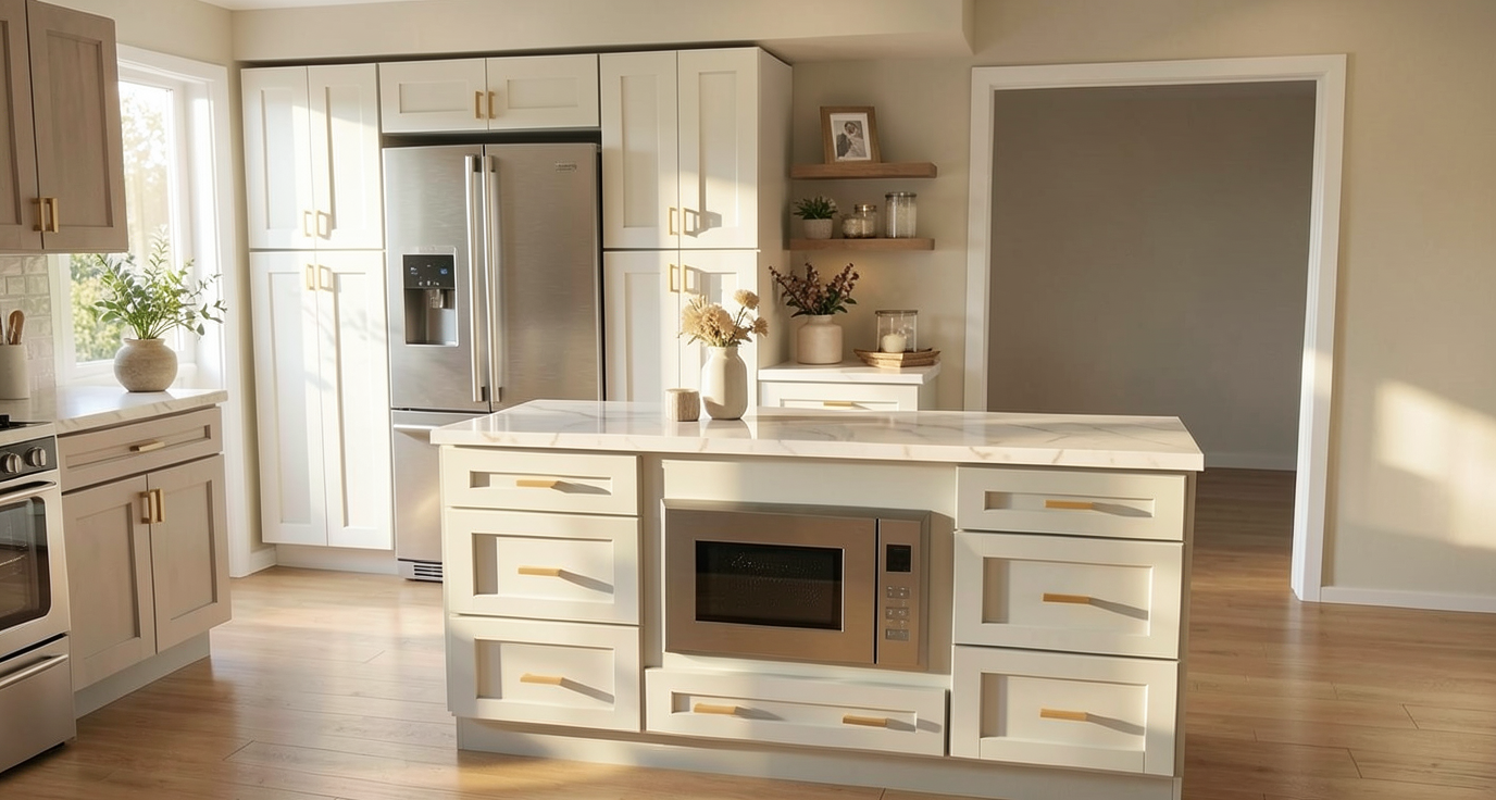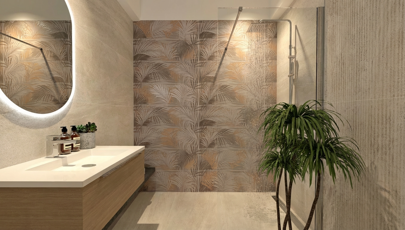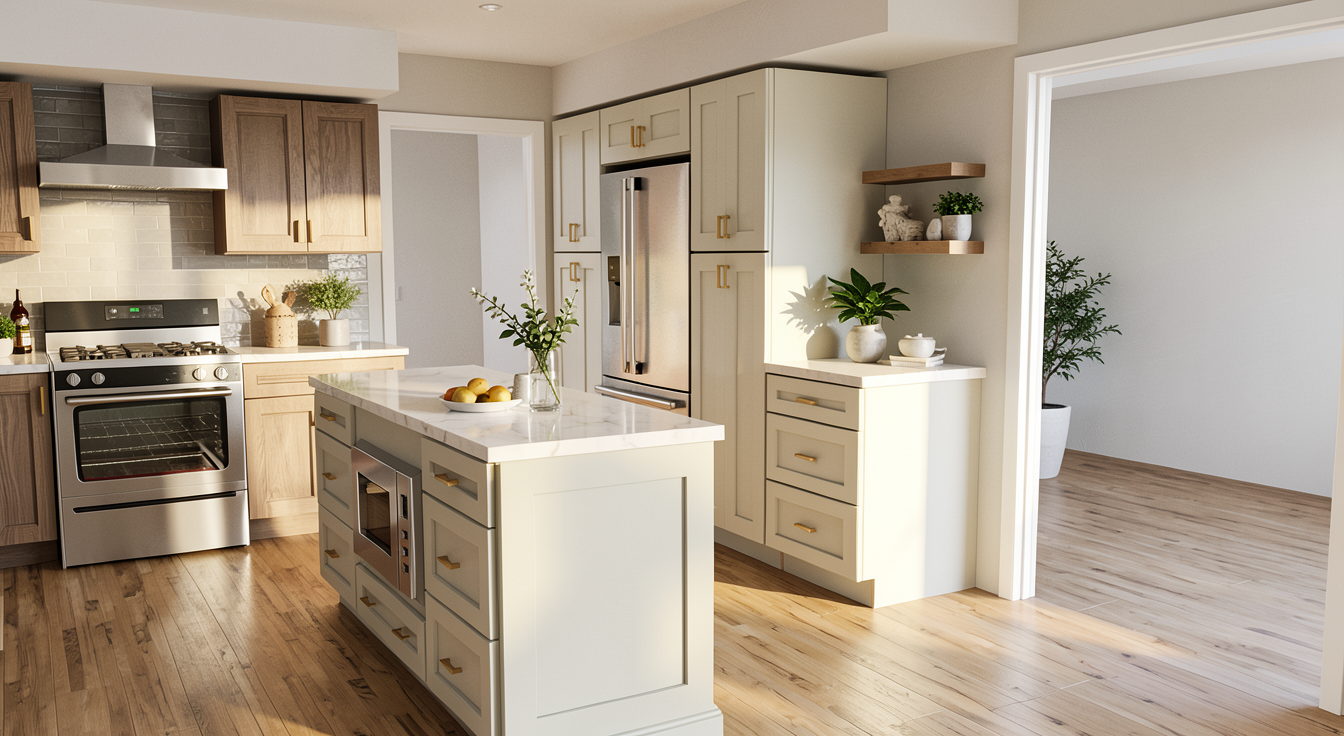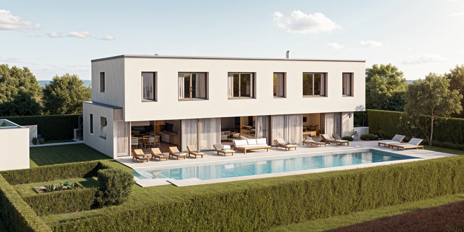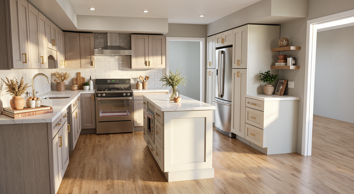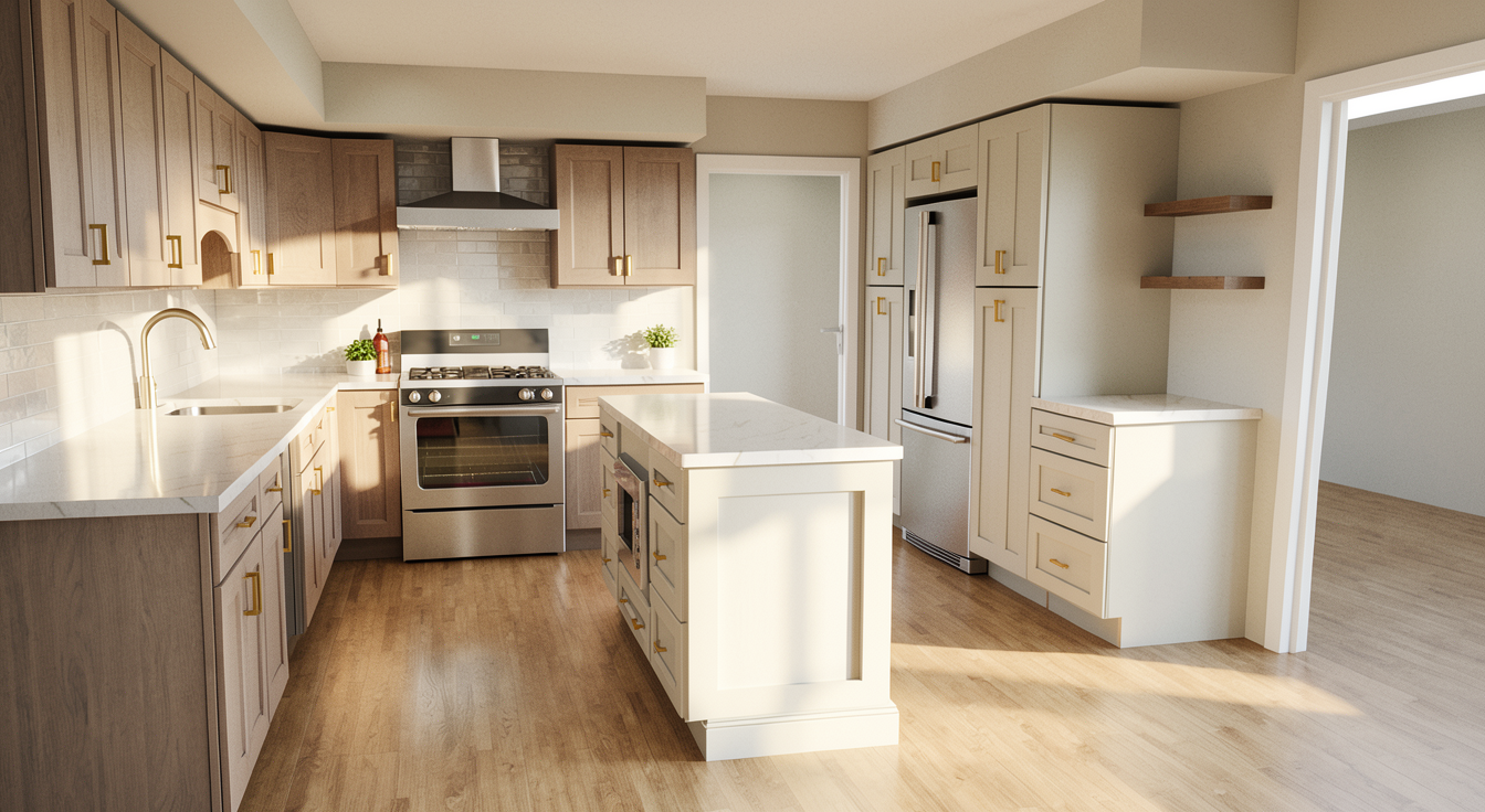 create a photorealistic rendering of a modern home interior based on the provided floor plan use warm earthy tones for the walls with soft beige and cream colors the floors should have a rich oak wood finish implement sleek contemporary furniture with dark leather and walnut wood accents add large windows to allow natural light to flow creating a bright and inviting atmosphere use modern lighting fixtures with a brushed metal look decorate with lush green houseplants and minimalist artwork for a cozy yet stylish ambiance