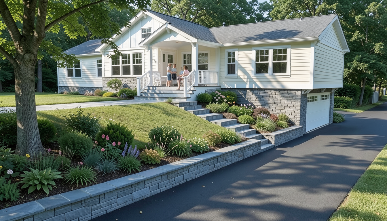 white trim and off white clapboard siding white cottage mullions grey stone stacked stone veneer in place of the brick grey tone patio pavers shrubs and flowers near the house trees behind the house and one in the foreground for shaddow and lighting to be realistic white wood furniture on the covered porch and people placed in the image to show realism and proper scale keep the image as close to the original as possible add a walkway from the middle of the stair straight out to the street the driveway is just asphalt and stops just beyond the garage doors grass in the backyard and shrubs between the driveway and the grass the stone stairs shall be large slabs of bluestone widen the driveway and and keep the retaining wall keep the image realistic tone the color down a bit so it looks more realistic