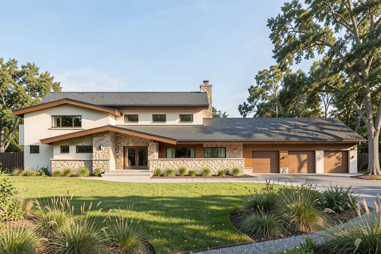 a modern minimalist kitchen design darker parquet oak flooring compliments a combination of white and light wood grained casework with brass handles completes the design the atmosphere is calm and relaxing accented by lush green plants hanging in black pots the lighting is soft and natural creating a relaxing light filled atmosphere