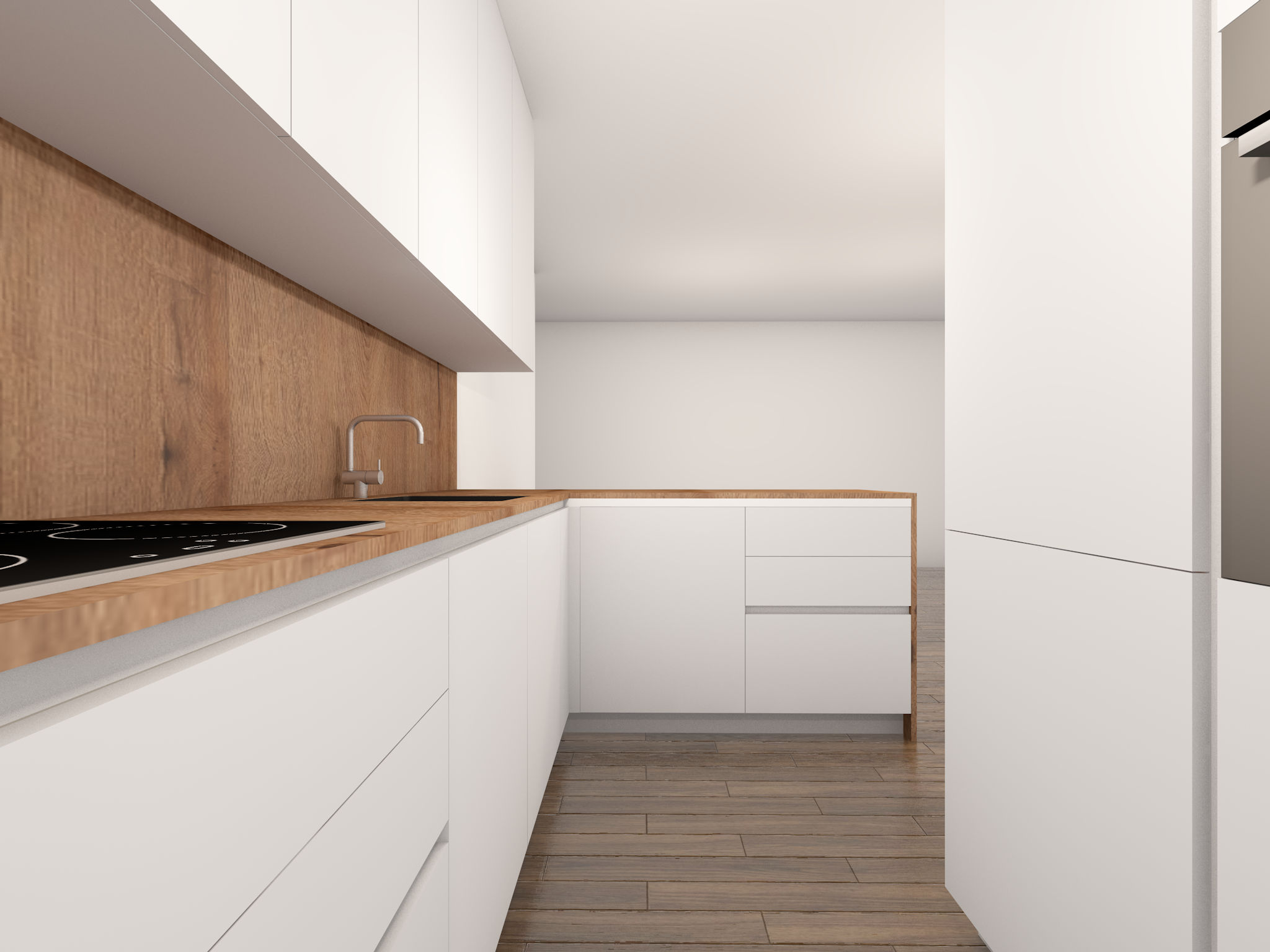 white glossy finish cabinets modern kitchen real textured wood counter high detailed render moderate lightning keep original nodes