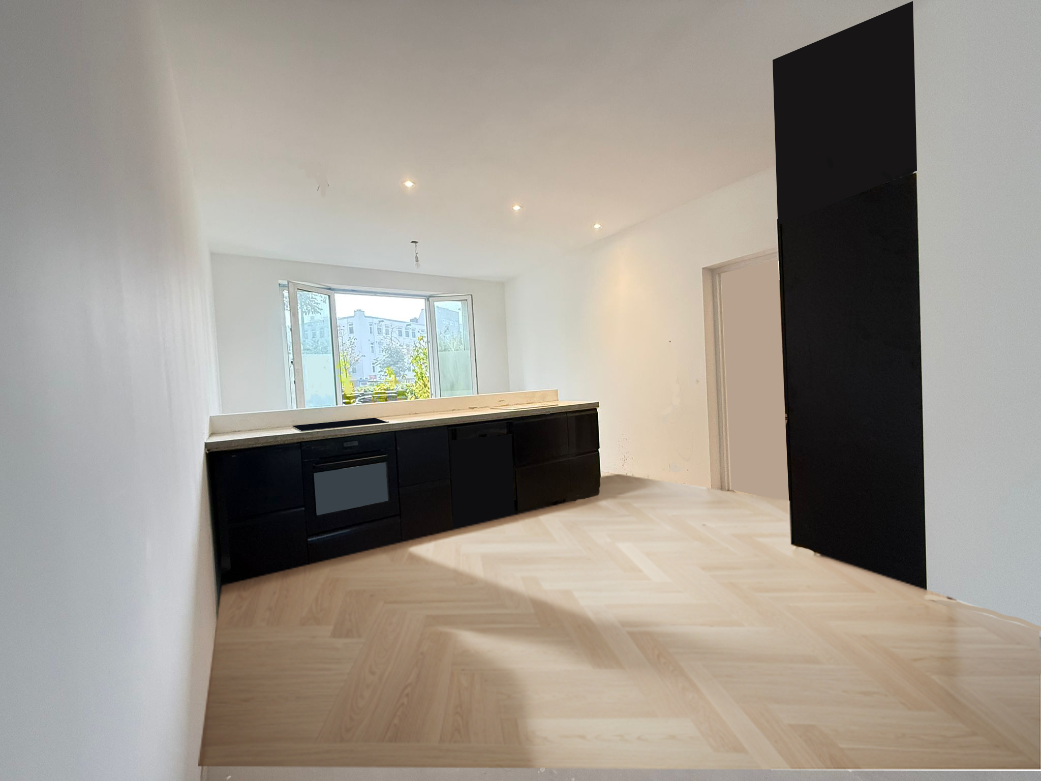 add a glass partition wall with wood frames above the small kitchen backsplash architecture