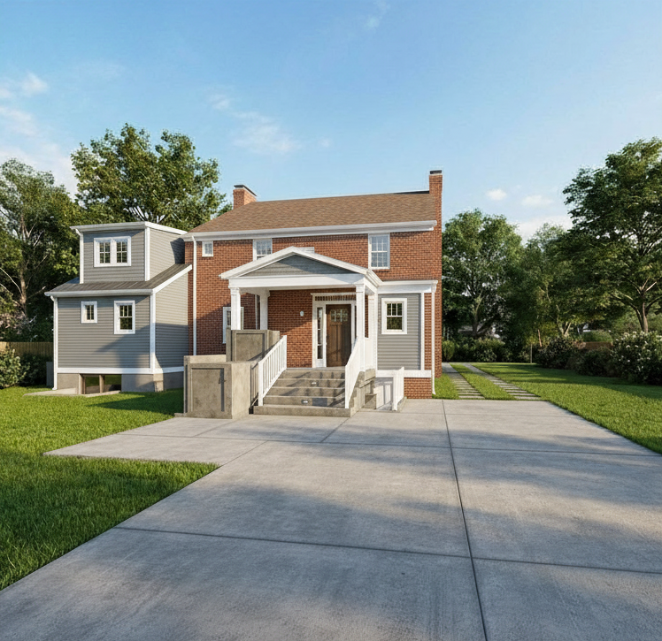 show the platform on the left side of the porch stairs as gray metal texture replace the door at the porch as a full glass door