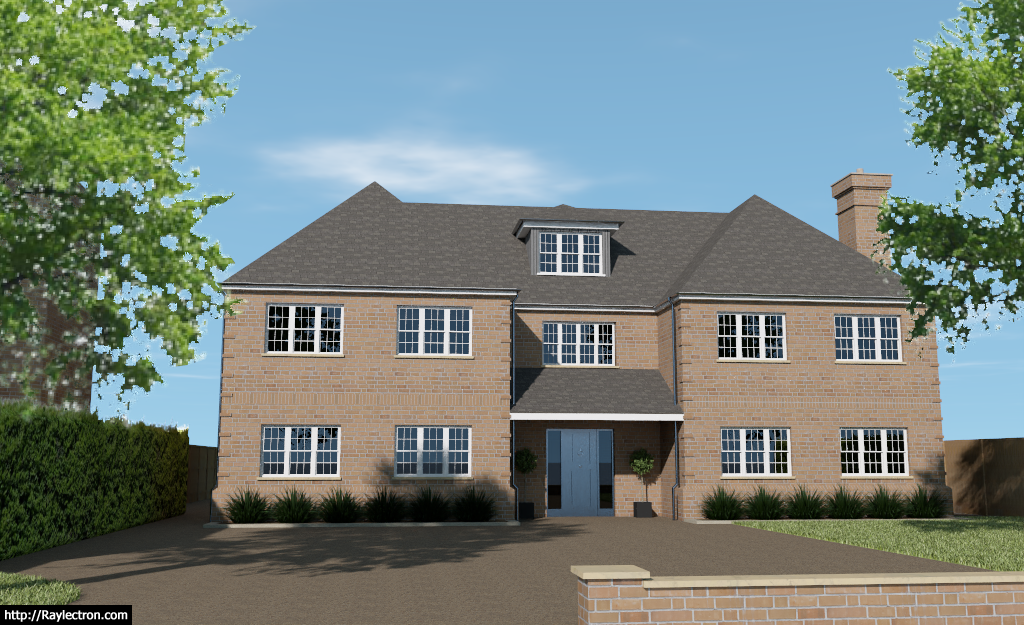 modernist exterior shot create a realistic and beautifully rendered image of a two story brick house with a gray slate roof use warm beige for the bricks soft gray for the shingles and crisp white for the window frames surround the house with lush green trees and bushes casting gentle shadows the driveway should be a dark coloured resin leading to a black high gloss front door with a chrome knocker and door handle place light blue skies with wispy white clouds above capturing a serene afternoon atmosphere enhance the sunlight to cast soft shadows giving a warm inviting feel architecture