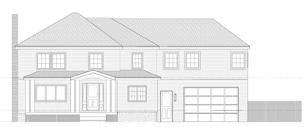 render the elevation to have light blue grey siding black mullions windows and white trim the roof should be a dark slate grey color the garage door should be white to match the trim the chimney should be a classic brick color the front door and sidelights should be a light white oak natural color