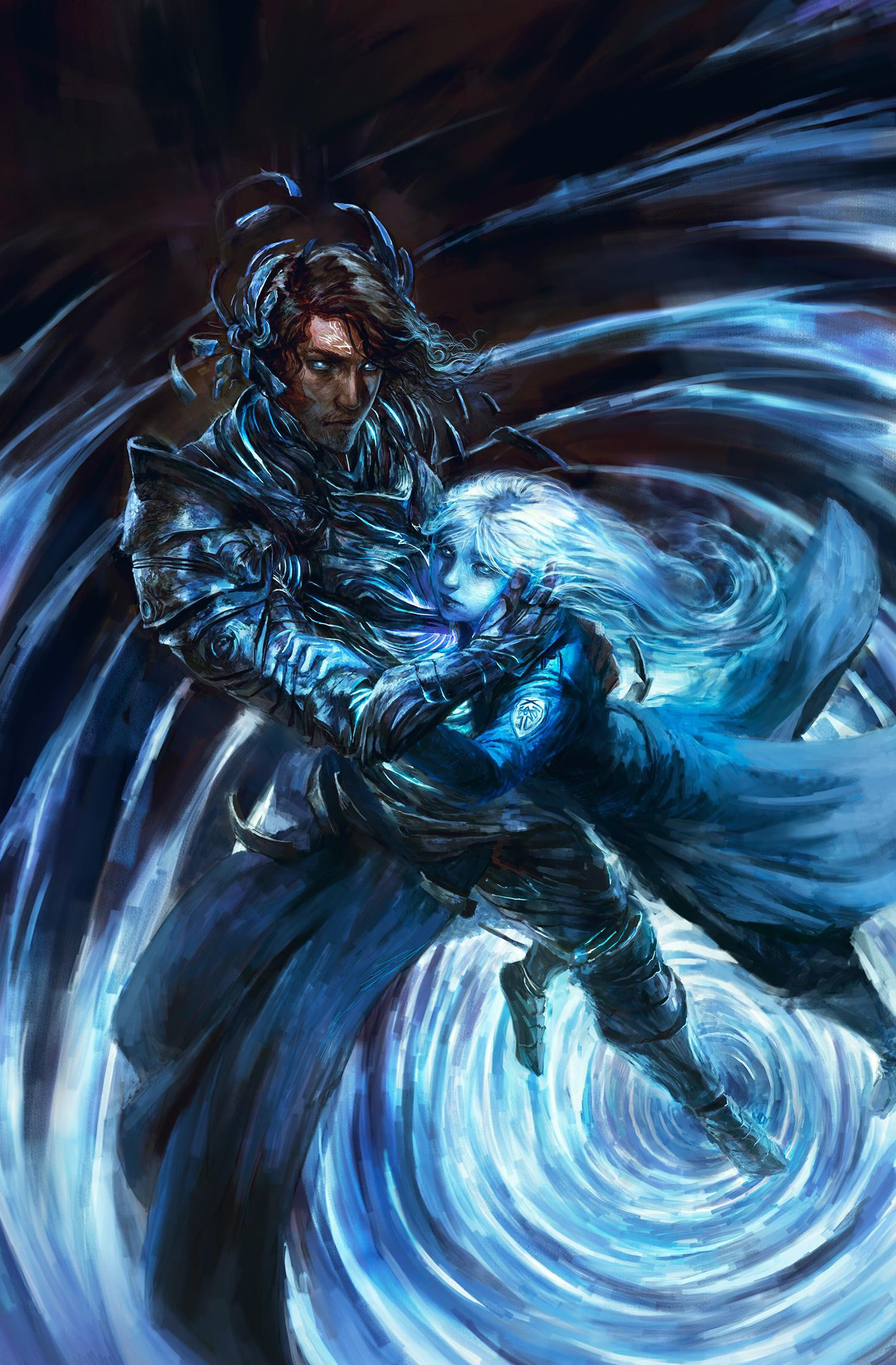 a man in forming armor holding a girl made of blue light
