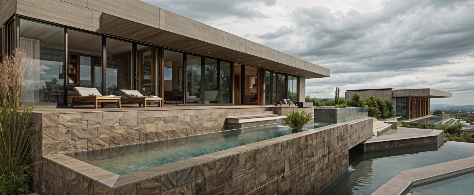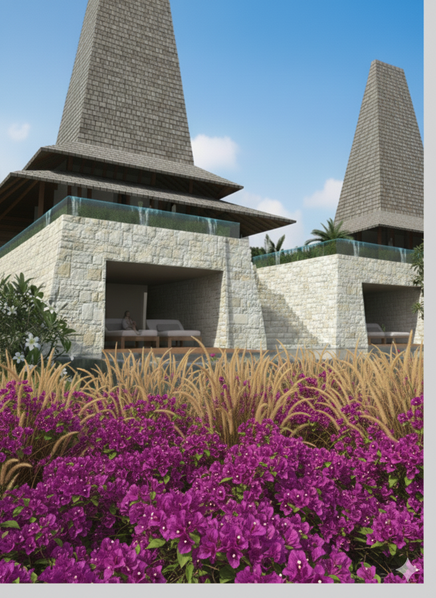 aerial shot enhance a realistic render of an estate building inspired by traditional sumbanese architecture integrating natural materials from sumba island such as thatched alang alang grass roof beige limestone walls and local hardwood details enhance the photography quality with the effect of a f 35 lens achieving ultra sharp depth of field crisp lines and balanced natural lighting for a professional architectural photo look