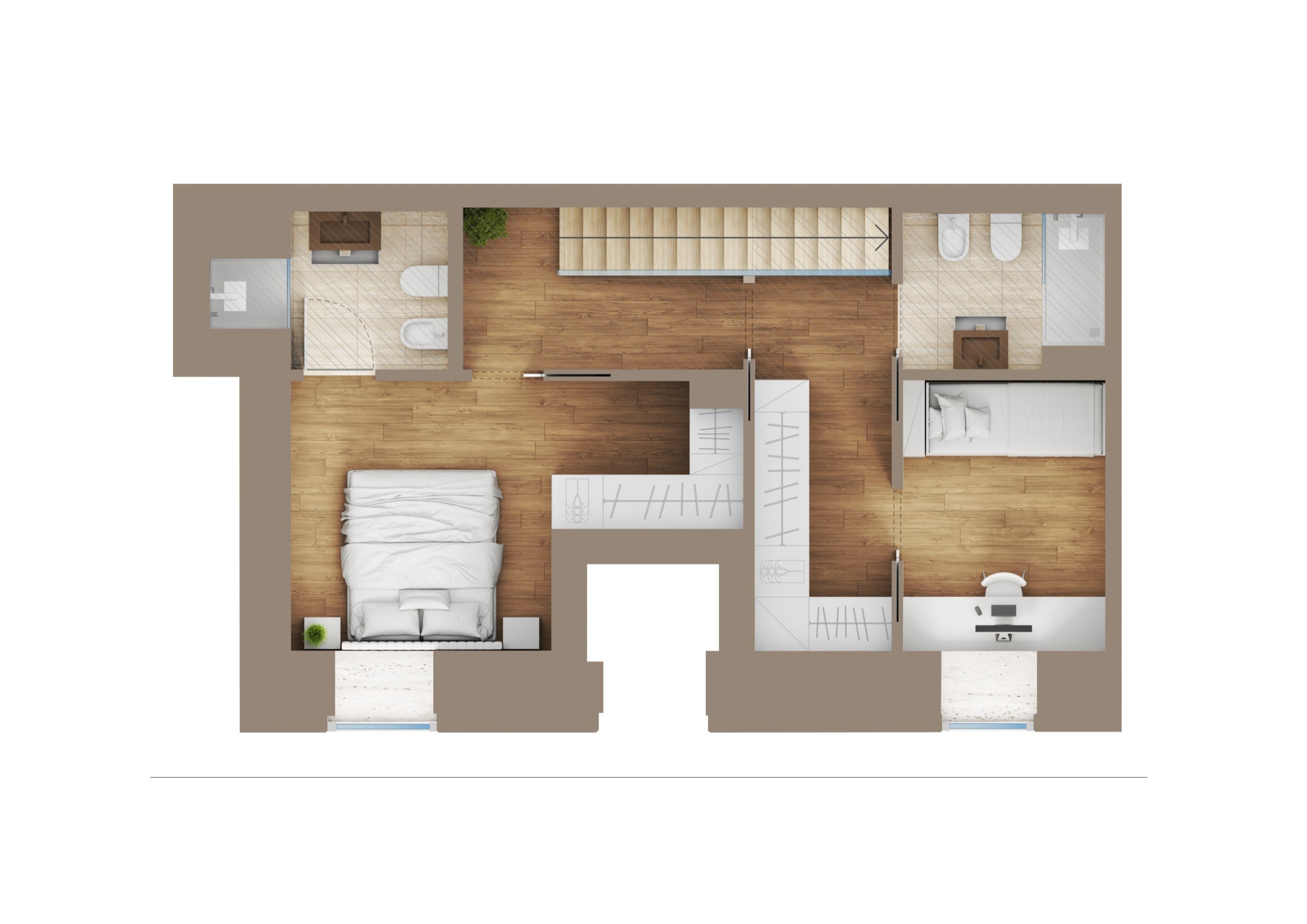 convert this floor plan into a realistic isometric 3d view of a full house show the space from an elevated angle with furniture walls and details visible sfondo bianco use the same furniture as shows on the plan do not change the orientation of the floorplan