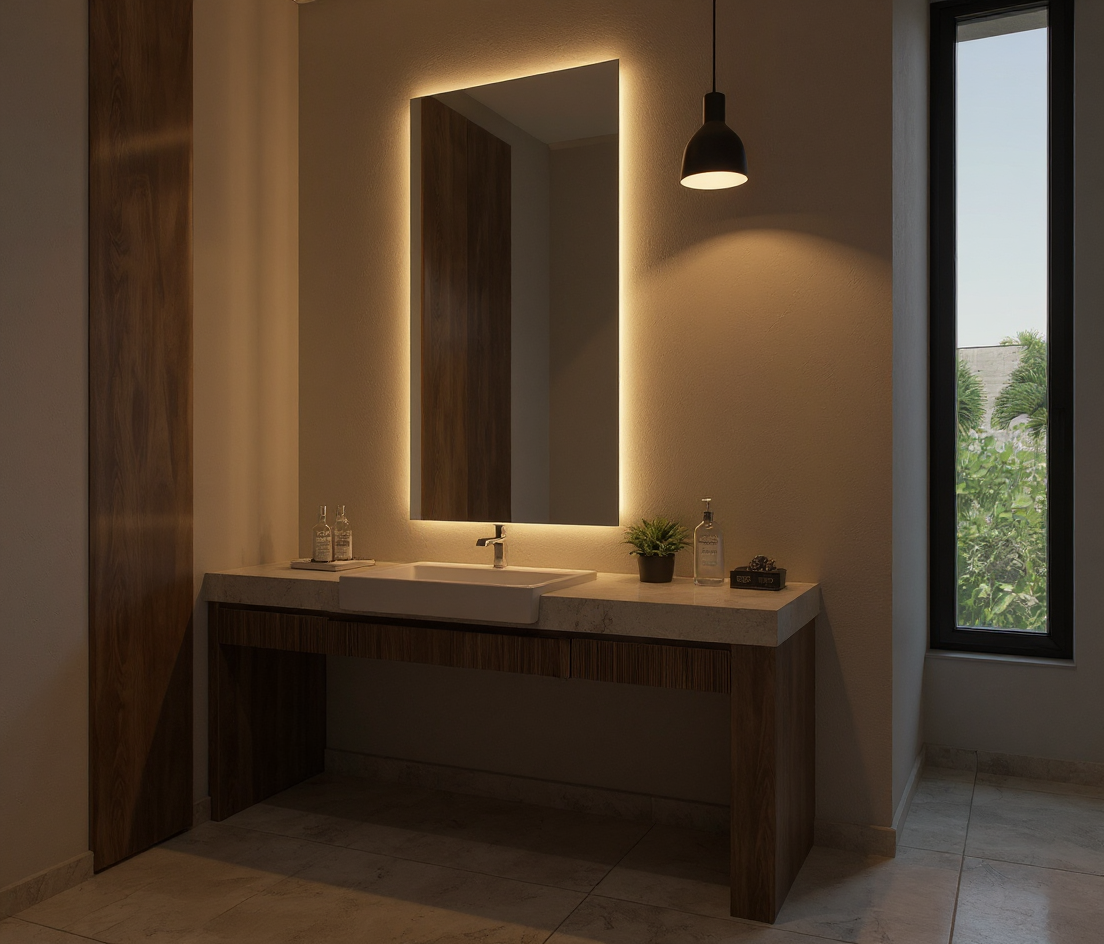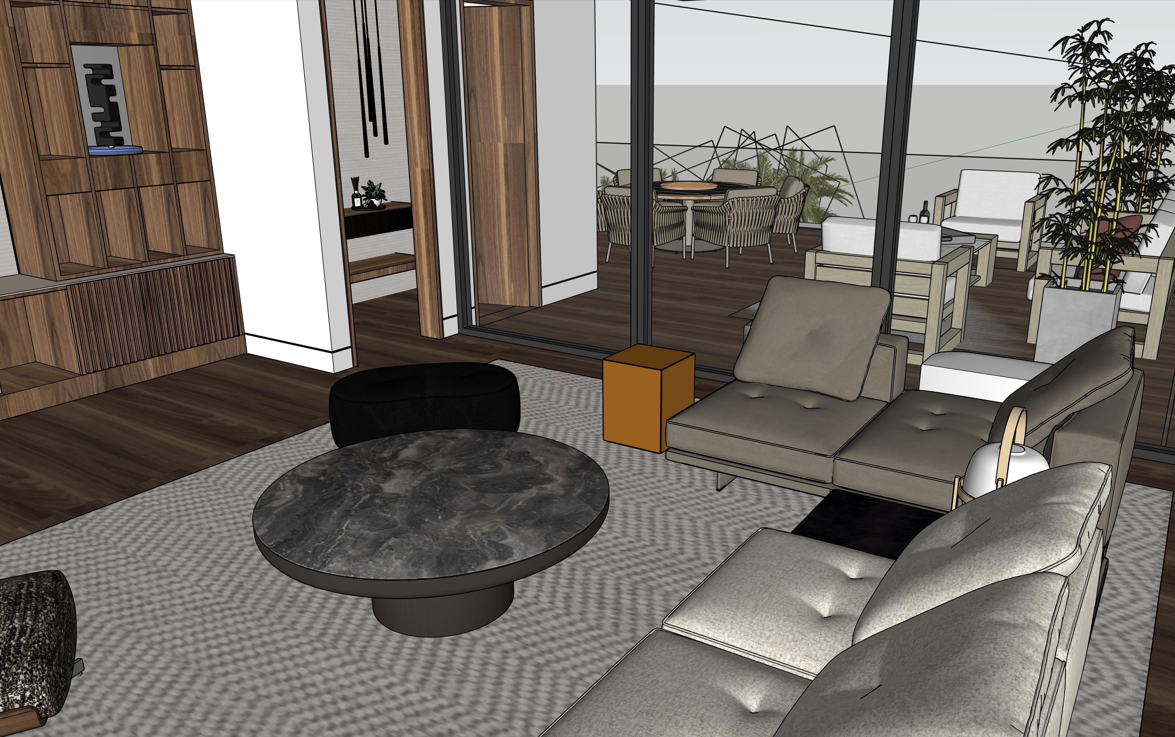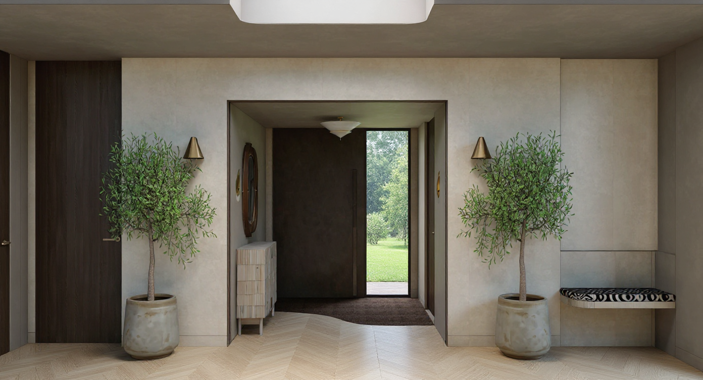 residential design minimalistic contemporary style walking closet with indirect lighting and crystal doors central bench with hidden drawers round soft rug in taupe color furnished over large scale beige color ceramics