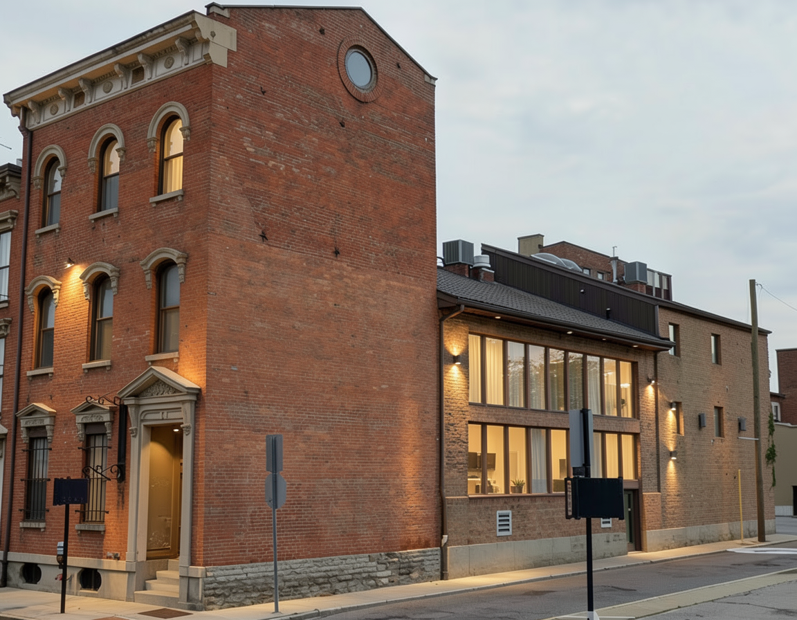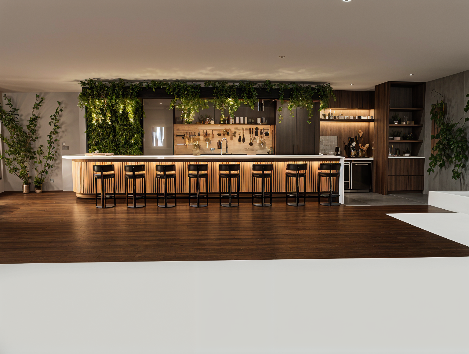 gym room keep back wall wood look wood is a lighter white oak gym floor is a concrete look black wall is a textured panel next to black wall is mirror linear light shines from black wall to wood glass doors to the hallway with wood floors and white wallpaper