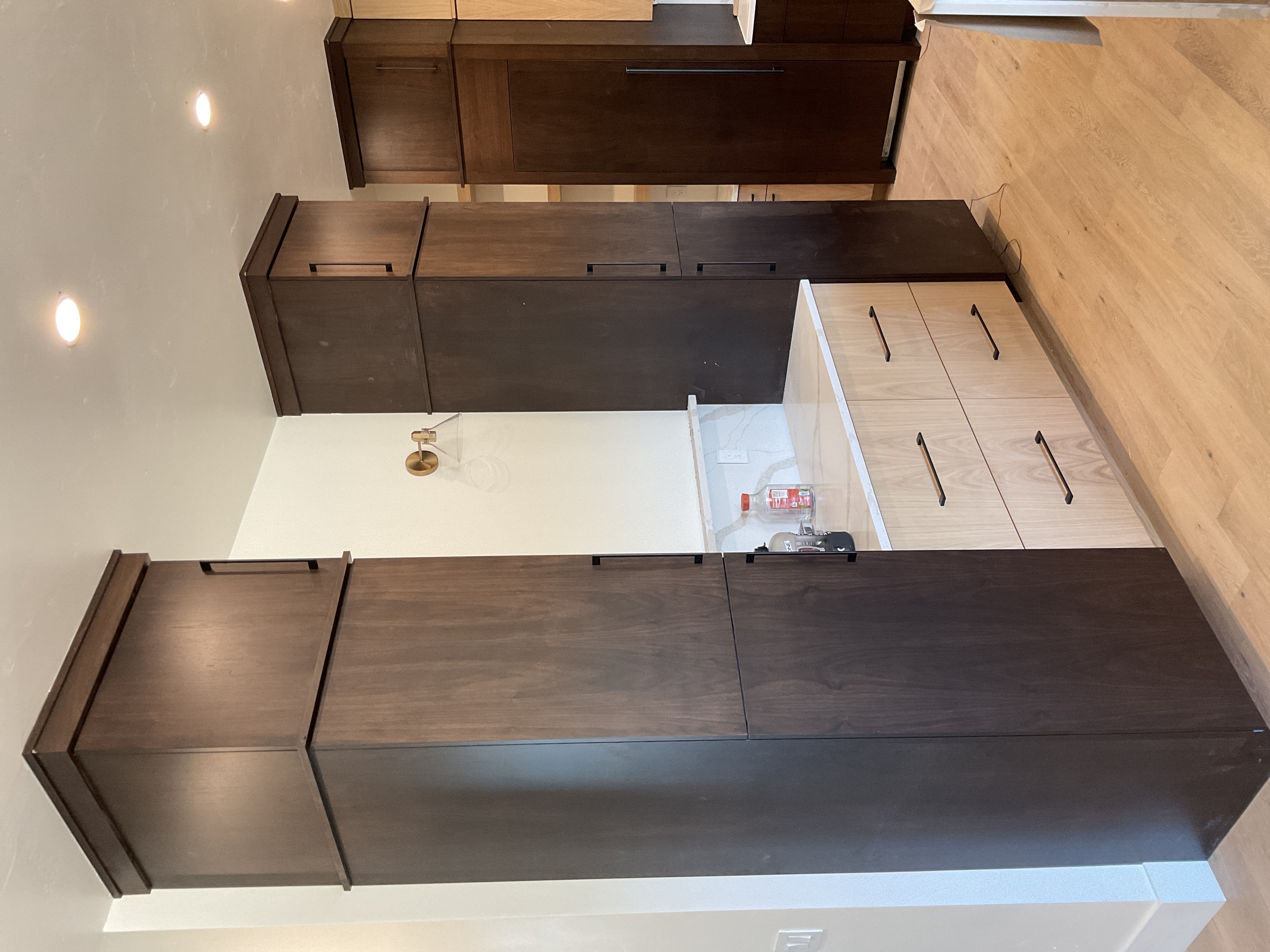 do not change the cabinets in any way preserve the exact cabinet colors materials finishes dimensions door and drawer styles hardware spacing alignment and all geometry exactly as shown do not alter the countertop shape backsplash appliances flooring lighting fixtures or wall structure only remove the construction materials clutter and mess from the scene clean the room and make it look finished and staged add a few simple tasteful home accessories appropriate for the style of the space but do not add or remove any furniture windows or architectural elements maintain the original lighting direction and realism enhance clarity and polish the photo while keeping the cabinetry and room design completely unchanged do not alter the lighting to keep the cabinet colors as they are in the image keep perspective as is turn the lights on add a picture above the backsplash stage as an entertaining modern kitchen