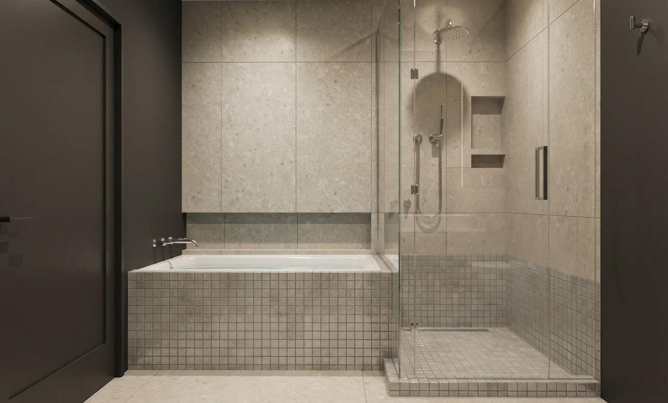 keep the exact layout materials and colors unchanged continue the tile on the tub shower wall all the way up to the ceiling including the same wall as the window above the tub stop tile at the edge of the tub maintain the same tile style and pattern do not change any other walls or materials
