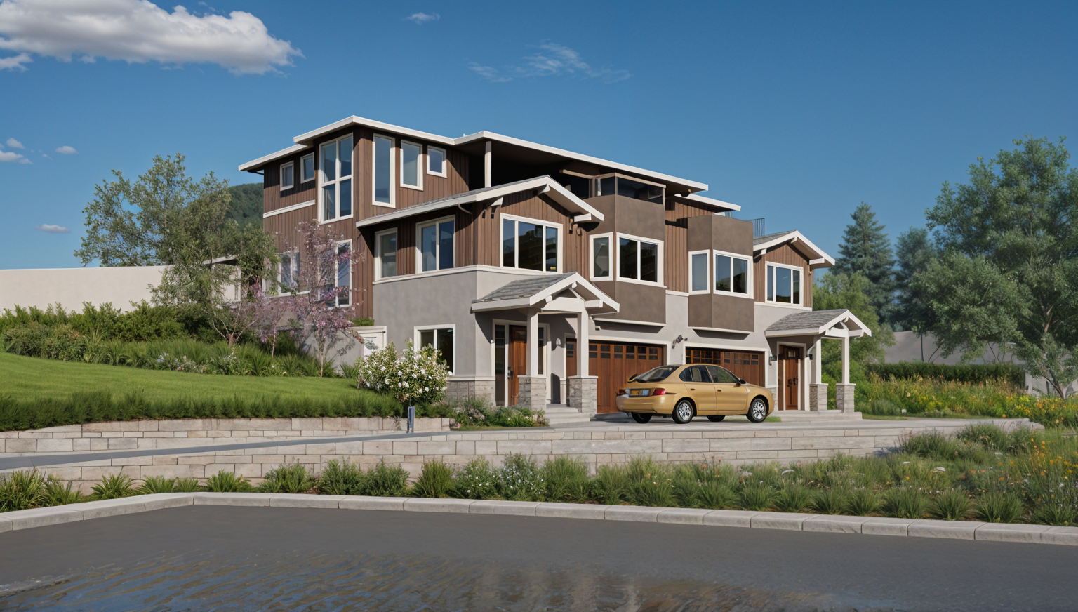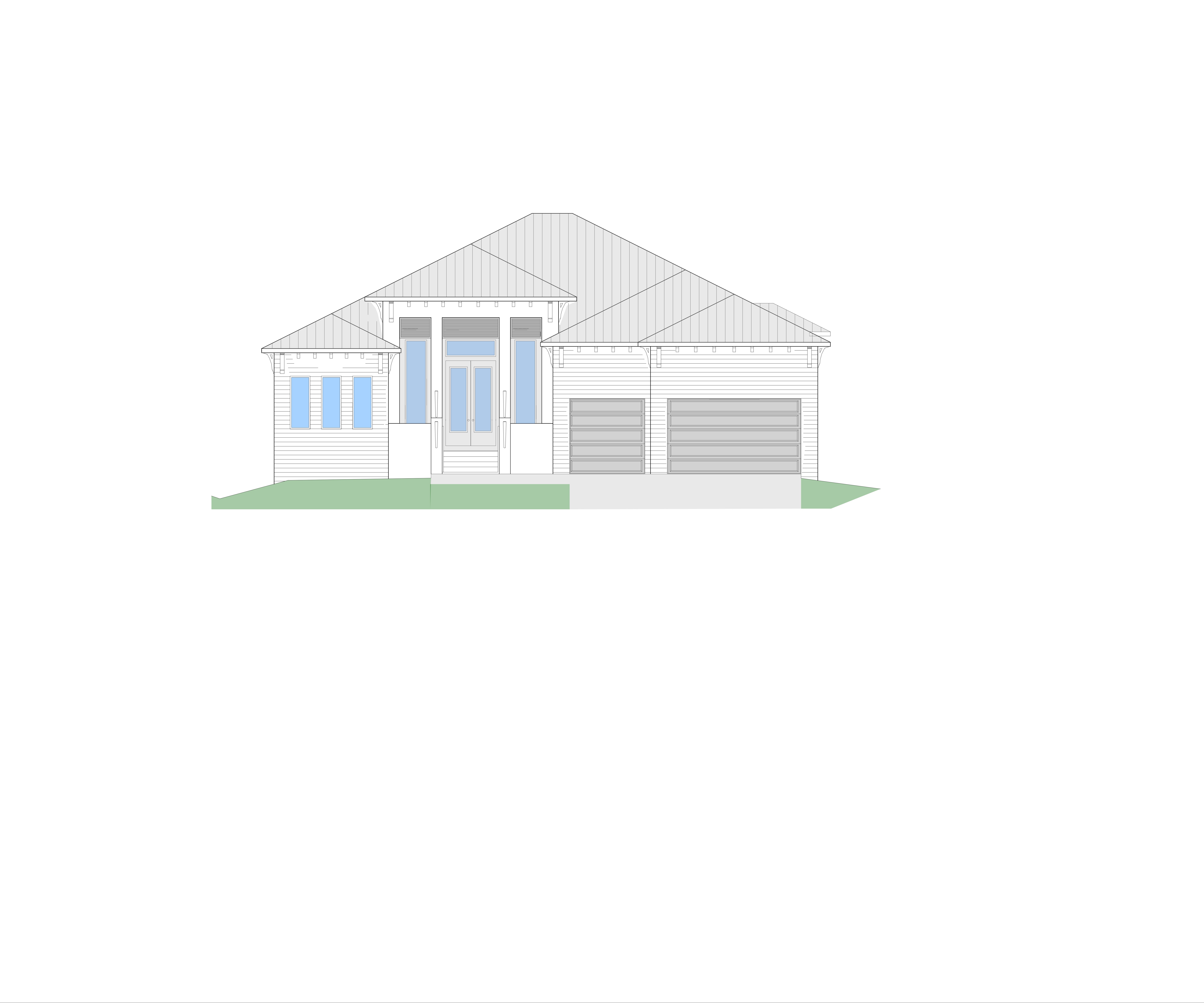 create a front elevation view with tropical landscaping blue sky and fair weather clouds light grey standing seam metal roof there are 3 equal fixed glass windows on the left side of home horizonal siding should be light blue on the left and right side of home remaining center area of house should be smooth finish stucco with white paint decorative shutters between each entry opening are dark blue corbels are white garage doors are white frame of entry french doors are white
