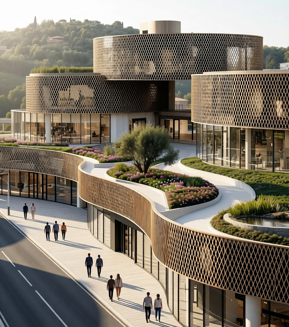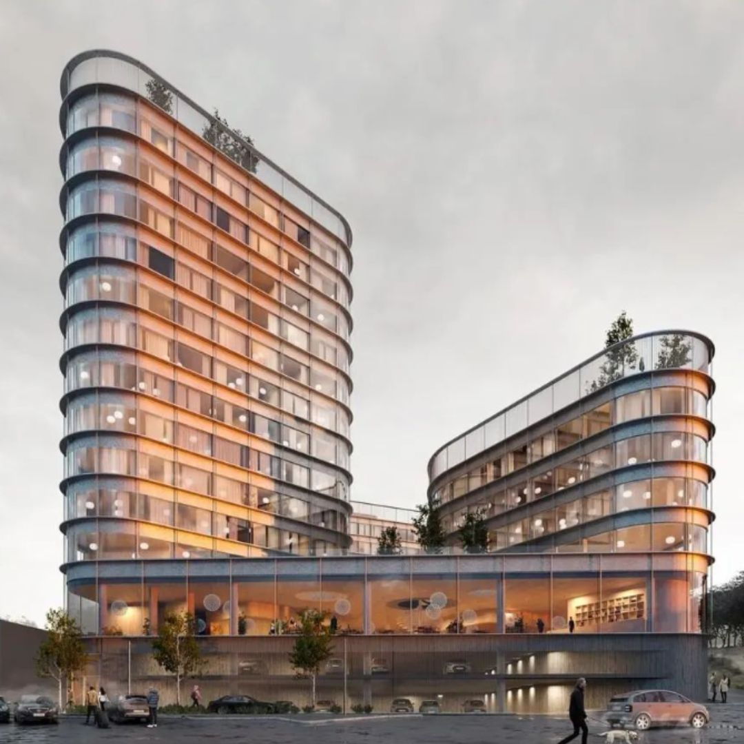 photorealist render make the building only 10 story high remove carse and include people it is an it building replicate the building design to the right and expand canvas