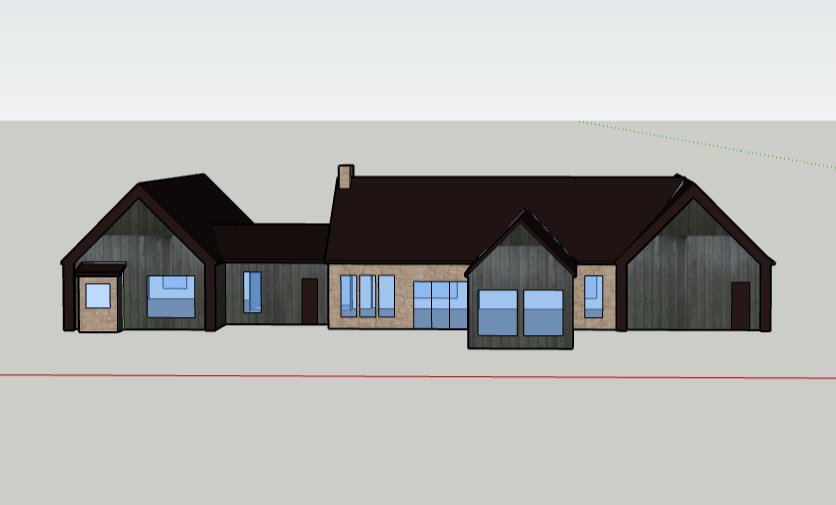 in a prairie manicured yard black metal roof black vertical shou sugi ban siding and light cream colored stone european like