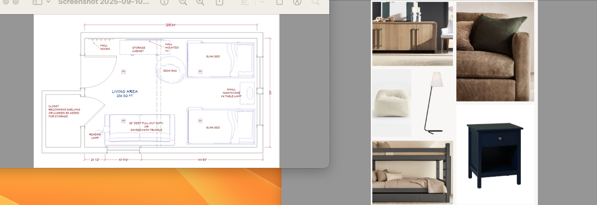 interior shot take this floor plan and moodboard and create a rendering of the bunk room staying constant with colors and show from door entry angle