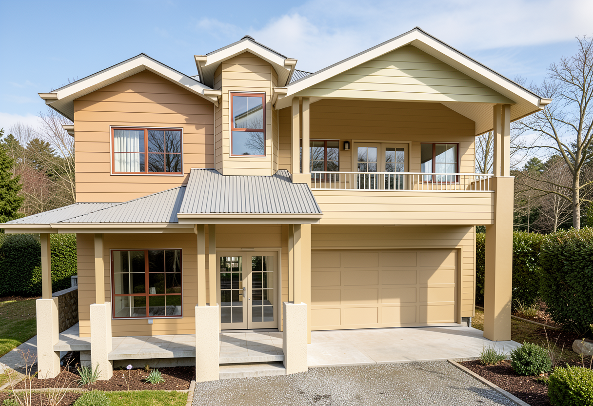 modern architectural design of a single story house featuring a clean minimalist aesthetic the house has a sleek slanted roof in a colorbond orb with basalt color for a sophisticated look the james hardie vertical oblique cladding is painted in a soft surfmist color giving it a smooth and elegant appearance the exterior is enhanced with vertical cedar cladding to add warmth and natural texture the atmosphere is calm and serene set against a bright clear sky the house has large windows for a welcoming ambiance framed by the natural beauty of the surroundings
