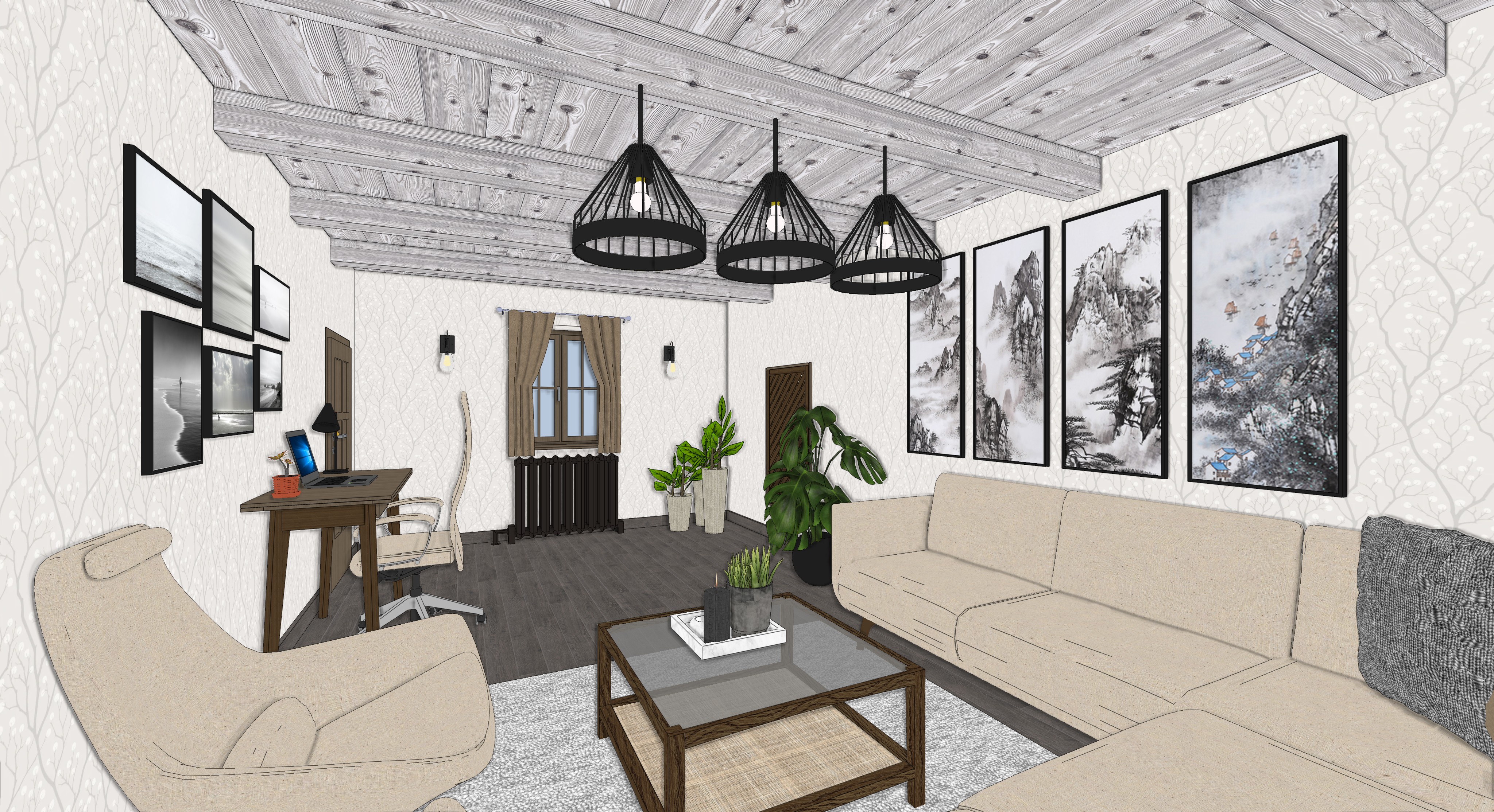 the ceiling features light gray wooden beams and the walls are adorned with subtle white patterned wallpaper the floor is a brown wood adding warmth to the space turn the lights on position a beige sectional sofa in the center complemented by a gray throw blanket a modern dark wood coffee table is set on a textured light gray rug include a few lush green indoor plants for a touch of nature on one side place a sleek wooden desk with a contemporary black and gold desk lamp and an open laptop accent the walls with a set of black and white framed photographs providing a minimalist aesthetic add large geometric black pendant lights hanging from the ceiling creating a focal point the atmosphere should feel cozy and inviting perfect for relaxation and creativity