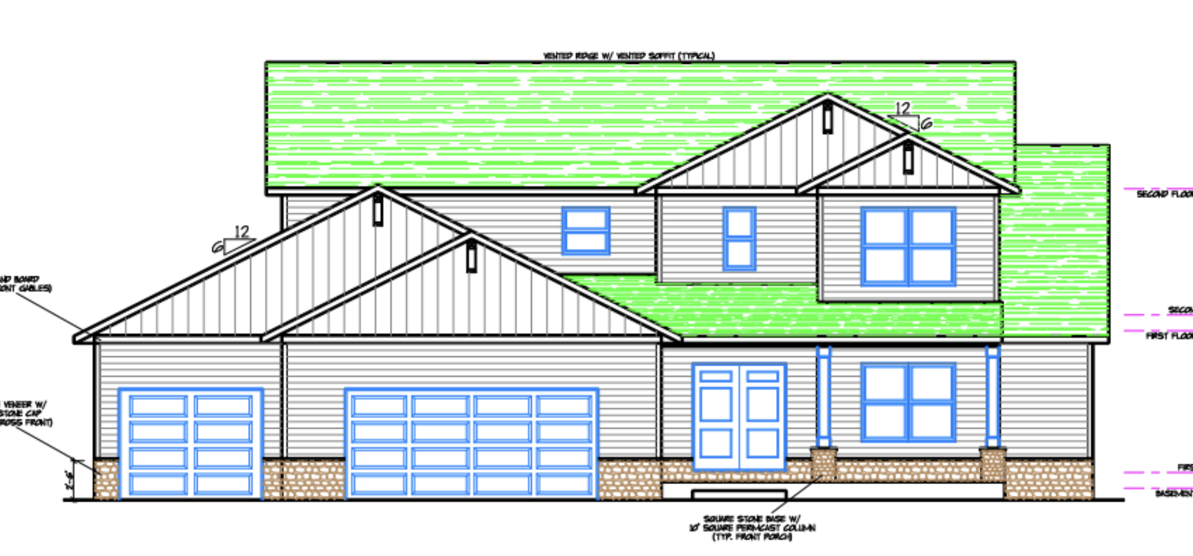 render a realistic 3d front elevation of a home based on the following finish selections and materials the goal is to accurately represent the colors textures and materials from the 2d elevation drawing specifications windows quaker manchester series white frames no grill pattern garage doors traditional long panel style in bronze no glass no decorative hardware siding certainteed encore double 4 lap siding in snow a crisp white tone note gable siding and gable brackets tbd leave neutral or minimal for now no white trim maintain a clean contrast between white siding and bronze accents roof certainteed landmark shingles in driftwood gray brown tone use over weatherwood to avoid overly brown hues stone edwards stone st gens dimensional with natural mortar gutters soffit and fascia rollex all in bronze front door double door in bronze finish with 3 4 glass panels rendering notes ensure accurate color relationships between white siding bronze trim and stone base emphasize realistic lighting and texture to show depth and material variation show full front elevation from eye level slightly angled perspective preferred