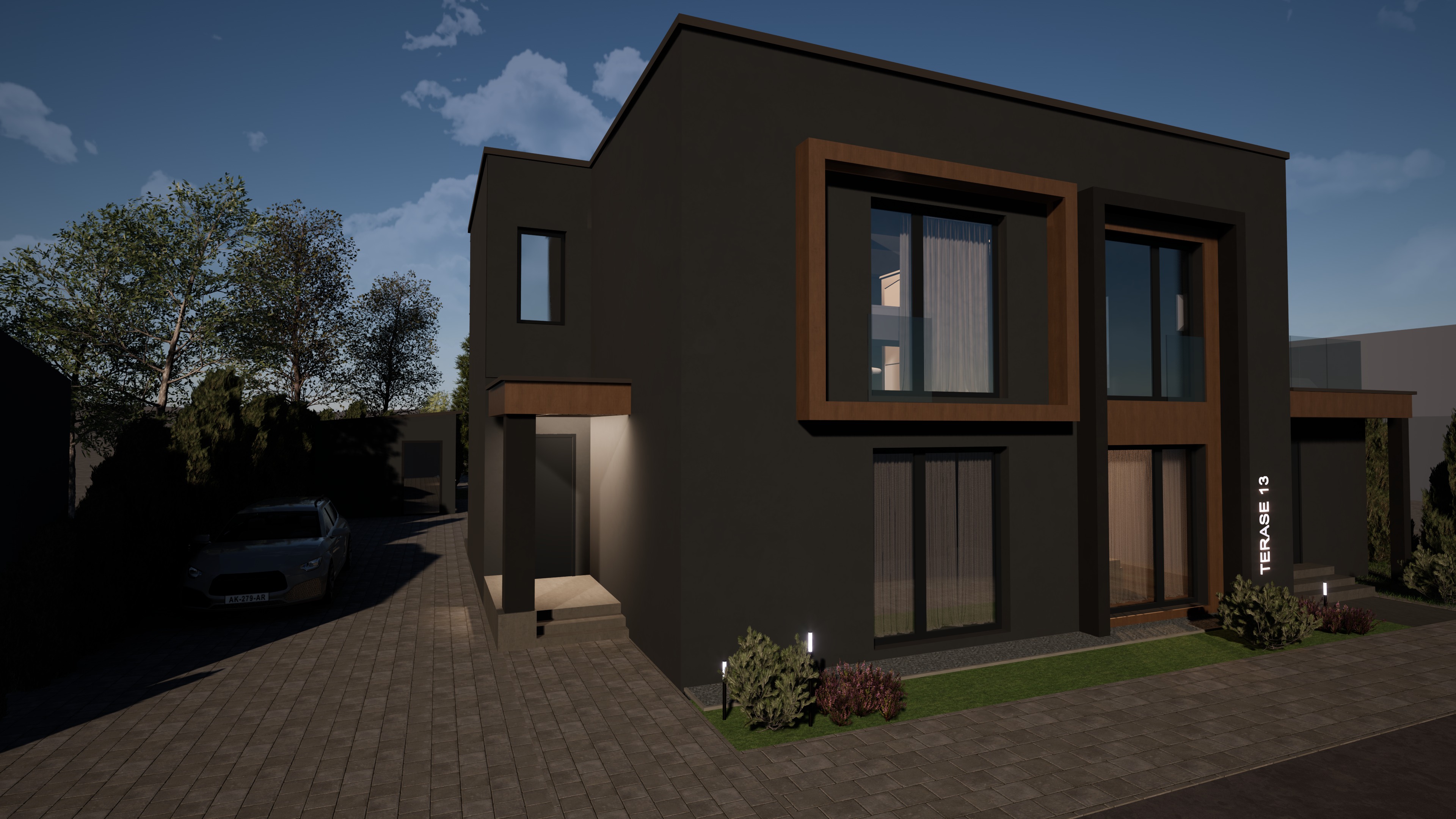 tee pilt fotorealistlikumaks ning s ilita t pselt sama nurk ja vaade fassaad peab olema musta krohviga ja htlase viimistlusega maja ees on k nnitee teekividest ja auotee paistab natukene muruplatsil on muru ja ksikud taimed muuda taevas eesti keskkonda sobivaks pigem v heste pilvedega maja asub linnakeskkonnas seega loo sellele vastav mbrus tee p evane pilt kuid nii et m nes ruumis oleks sisevalgus n htav