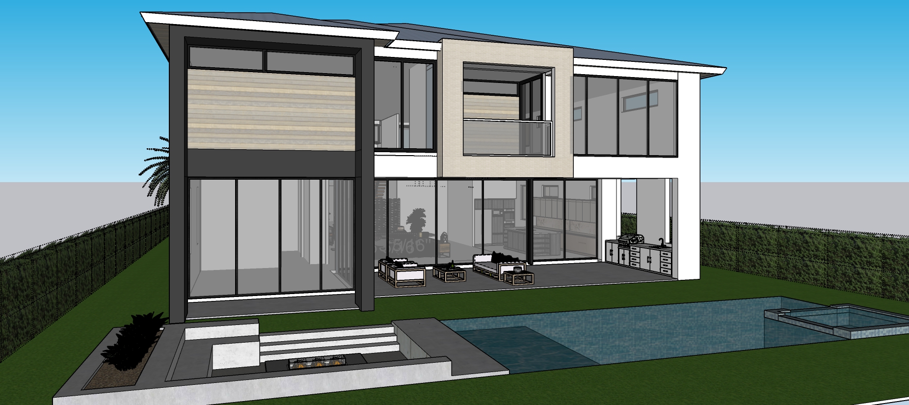 day blue sky with some clouds professional photography shot keep house layout structure and proportions please maintan the perspective image black metal roof